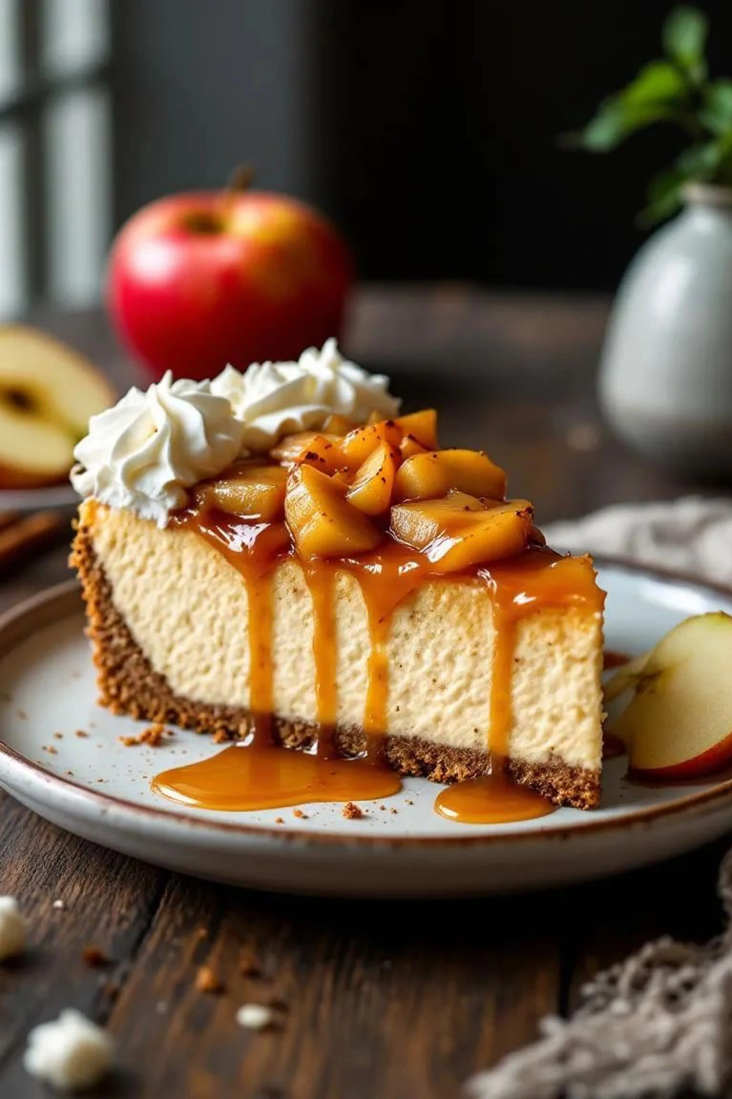 The first thing you notice is the shine—warm, lacquered caramel slipping over the edge of a pale, cloud-smooth cheesecake slice like it can’t help itself. It gathers at the plate in slow amber puddles, glossy enough to catch the light, the kind of sheen that makes you swear you can smell butter and toasted sugar before you even lean in. On top, apple pieces sit like little bronzed jewels—softened into tenderness, still holding their shape, kissed with spice and a faint freckle of something dark and aromatic. A swoop of whipped cream crowns the moment, bright and billowy, the way winter desserts always want to pretend they’re effortless.