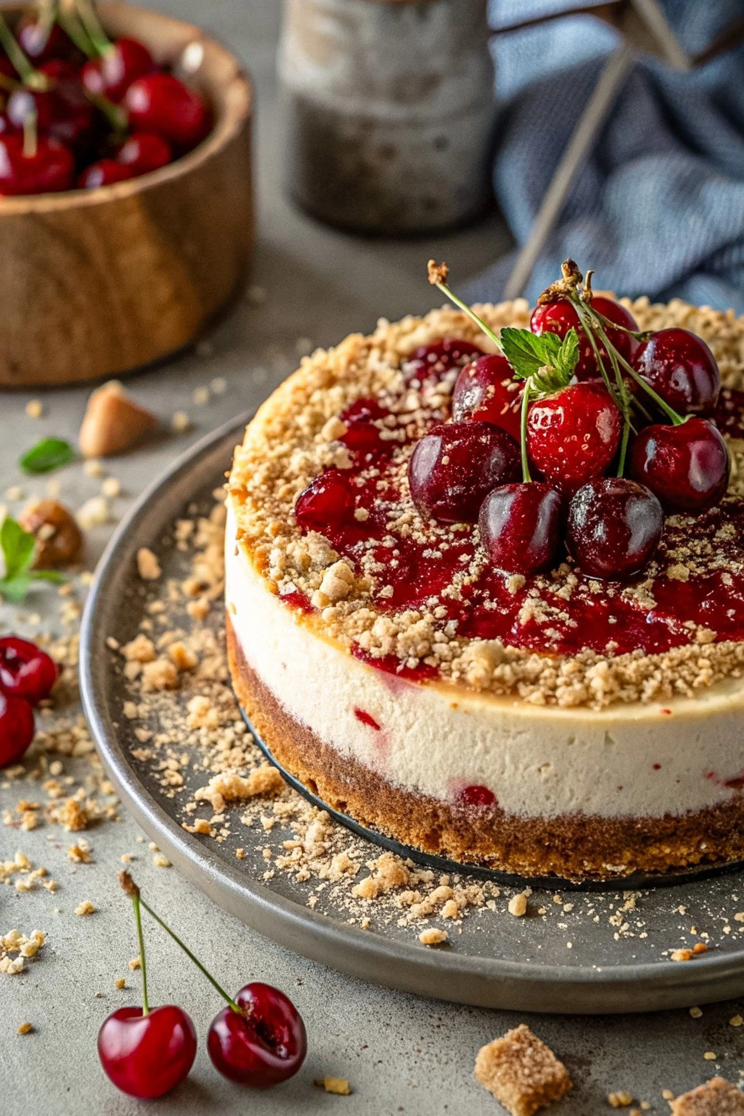 - Finish: Spread cherry topping over chilled cheesecake, sprinkle crumble, and pile fresh cherries in the center.