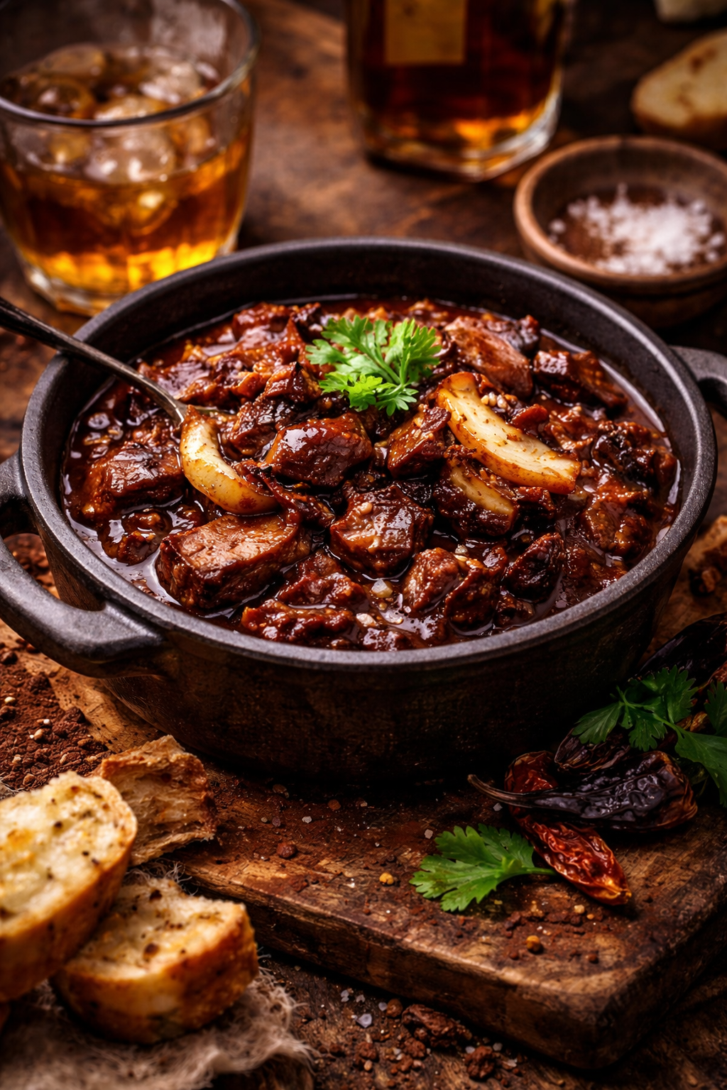 The scene around it matters. Rough wood beneath the pot carries scars of past meals and long conversations. Thick slices of bread rest nearby, their crusts cracked and ready to absorb whatever spills over the edge. In the background, amber liquid waits in a heavy glass, its warmth mirroring the chili’s depth. Everything about the setting feels intentional, grounded, and unhurried — the kind of moment that only exists when time is allowed to stretch.