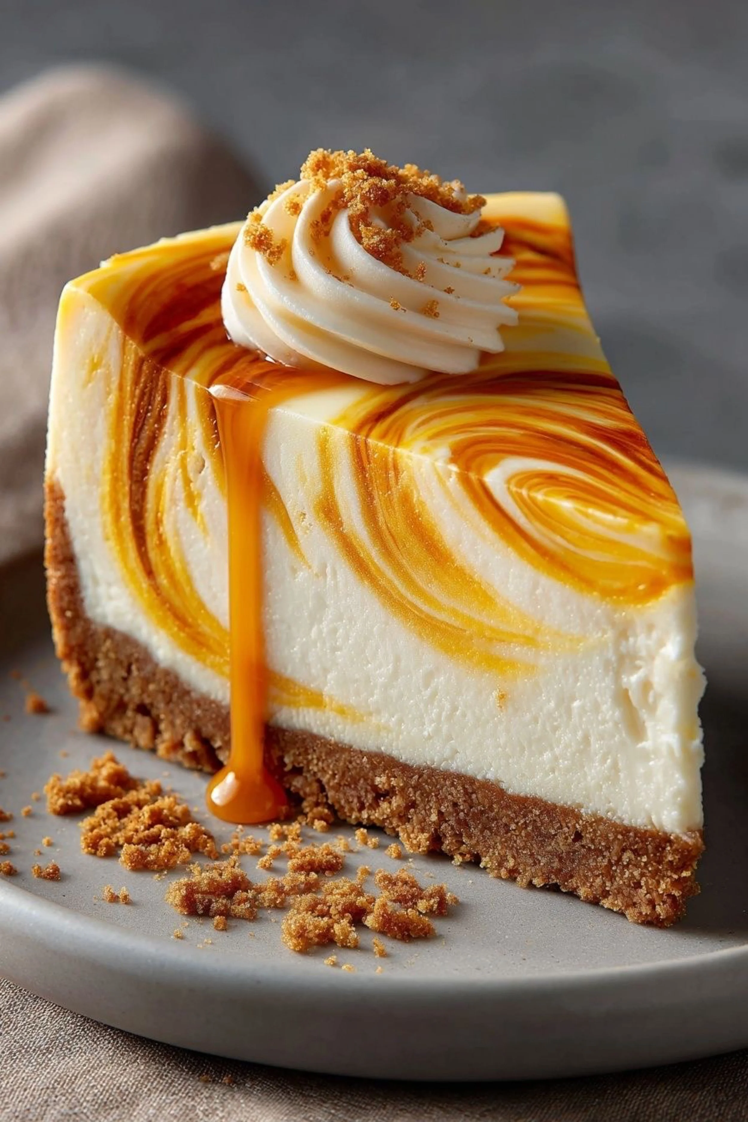 The first thing you notice is the shine—an amber ribbon caught mid-motion, as if someone poured sunset straight onto a quiet wedge of cheesecake and it decided to stay there. The top is a map of slow spirals, honeyed and bold, drifting through pale cream like marble warmed by a flame. One glossy drip escapes the edge and trails down the side in a single confident line, pooling at the base with the kind of patience that only caramel seems to have. The slice sits on a simple plate that makes it feel even more dramatic, the background soft and gray like a winter afternoon, everything pulled back so the dessert can take the spotlight.