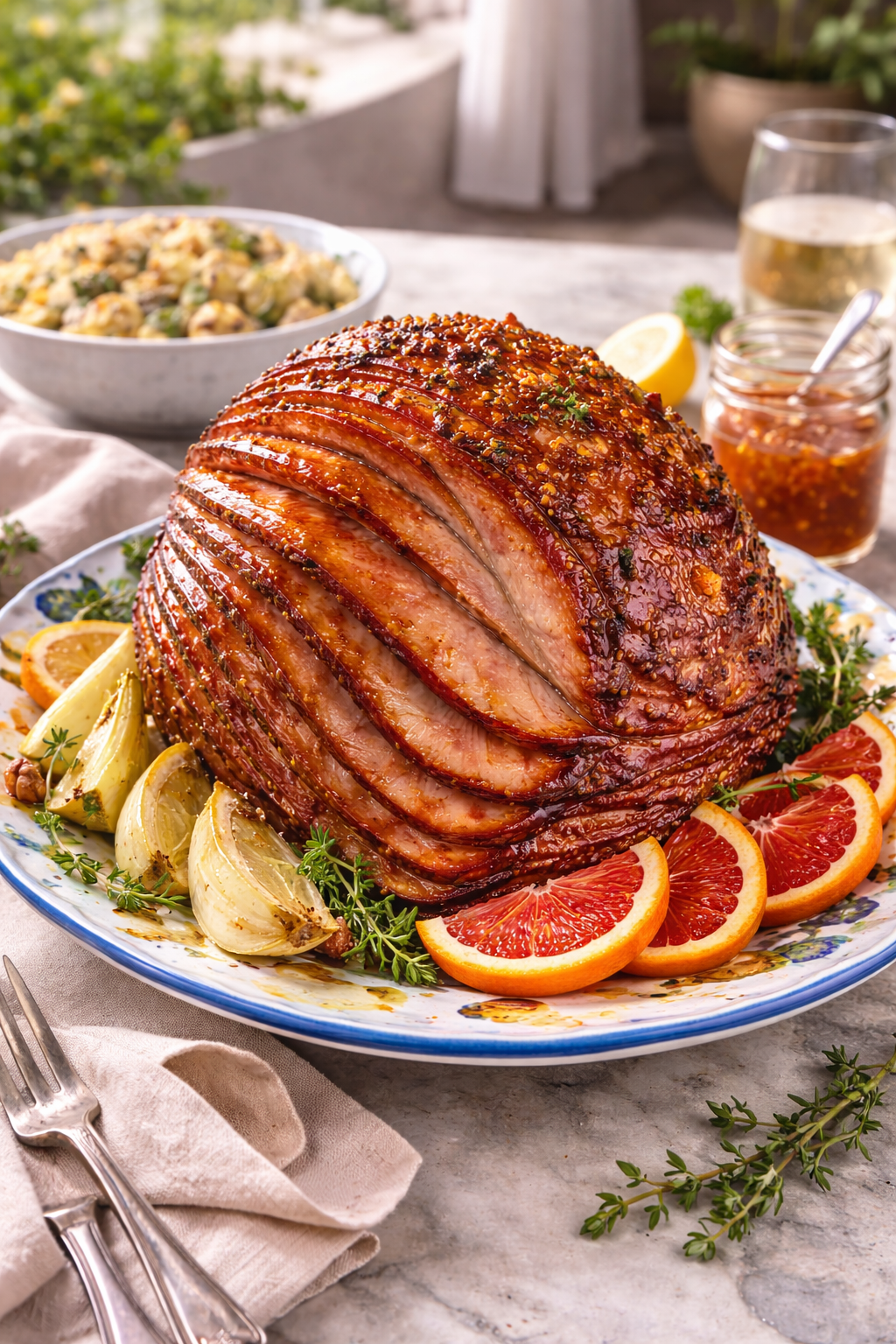 When it’s done right, you get that exact visual promise: a ham that looks carved and lacquered, citrus that brightens every bite, and edges that taste like the best part of the pan—sweet, salty, and just a little smoky.