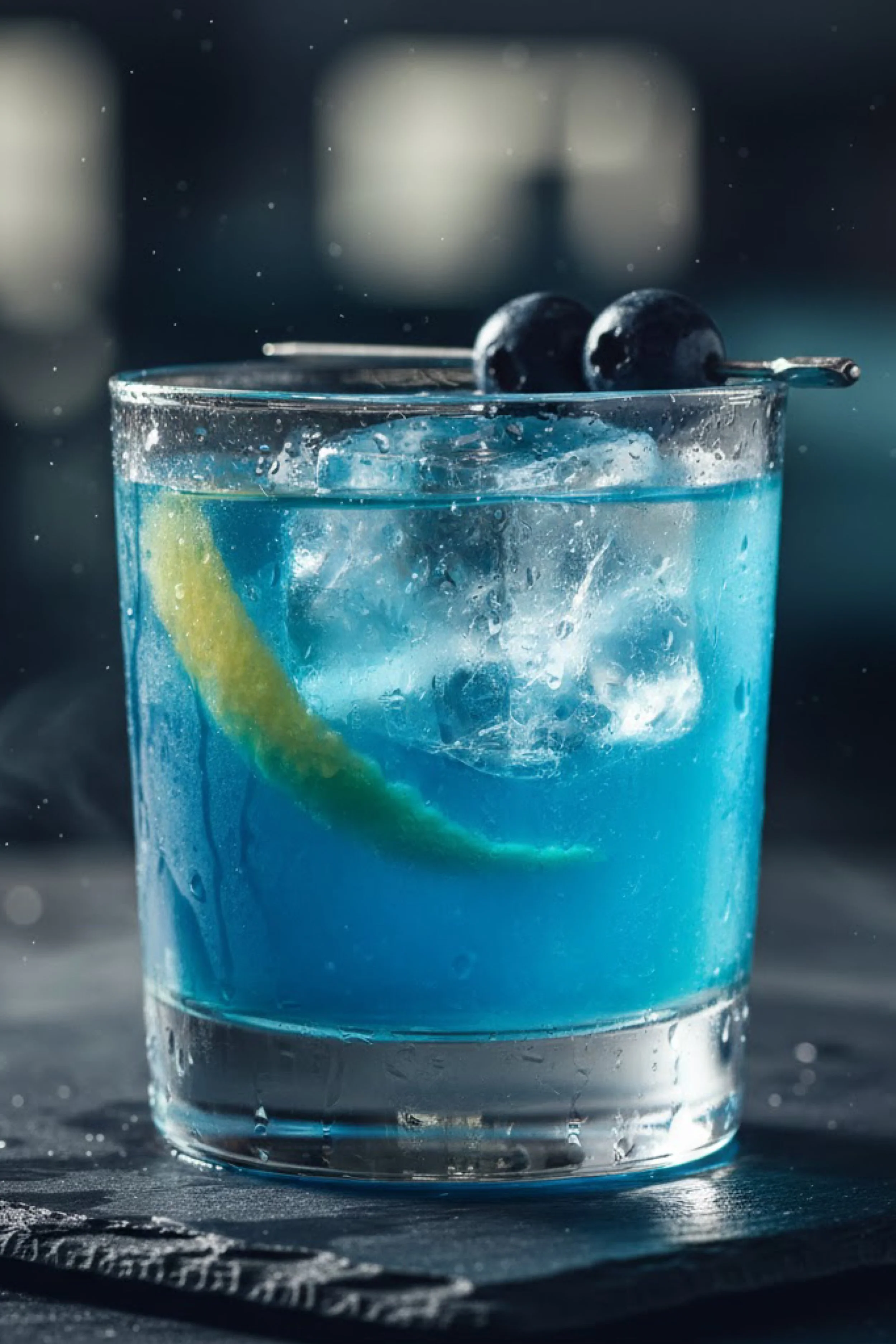 The first thing you notice is the color—an impossible, electric blue that looks like it was poured straight from a midnight neon sign into a heavy glass. It catches the light the way stained glass does in a quiet room: luminous, confident, just a little mischievous. Ice sits in the drink like carved crystal, fractured and bright, holding tiny trapped galaxies of air. Condensation beads along the outside of the tumbler, slipping and gathering in slow motion, as if the glass itself is breathing in the cold.