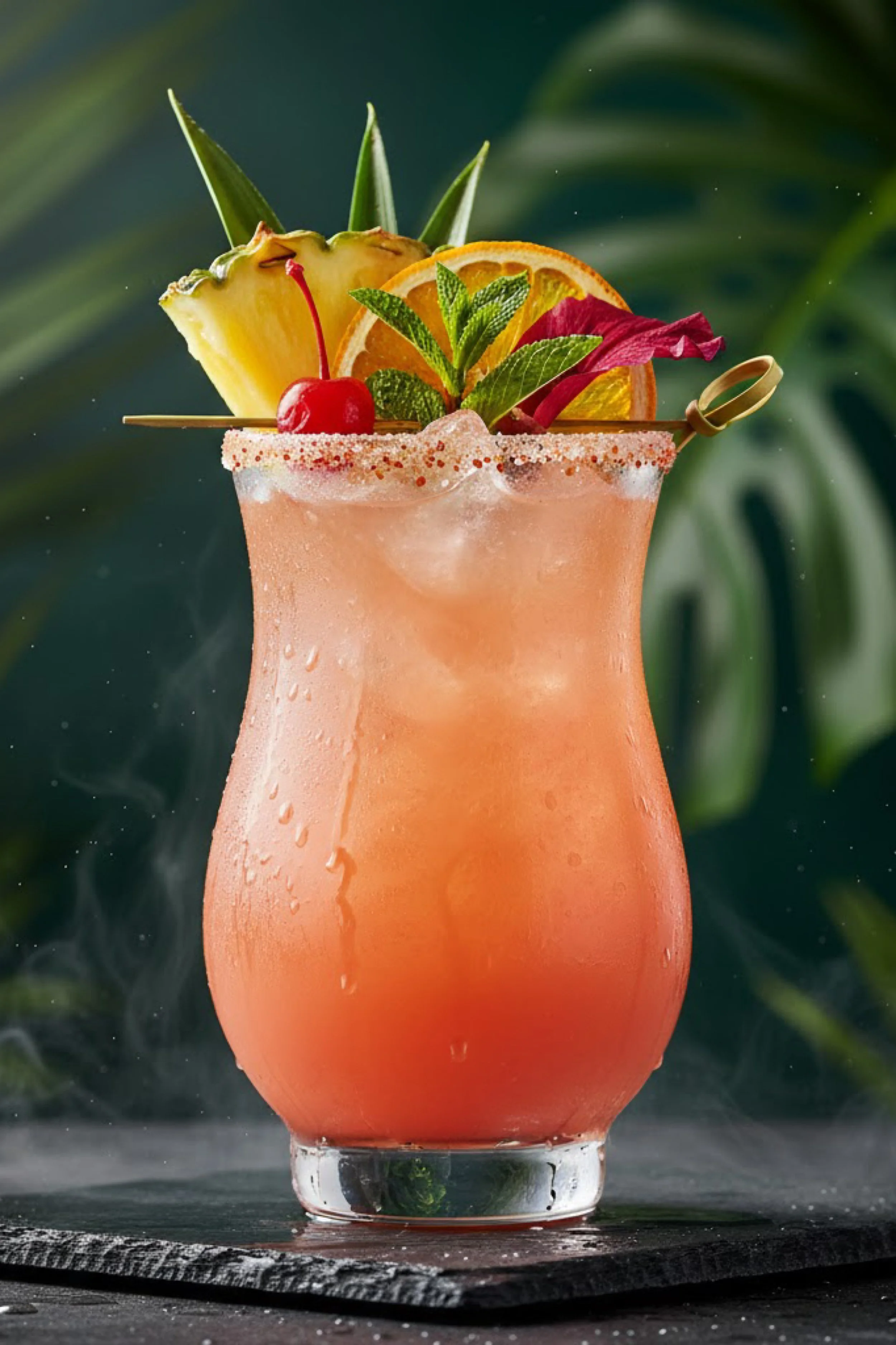 Garnish like you mean it. A small garnish looks timid in a big glass; go oversized. Pineapple wedge first (it’s the “jungle” cue), then an orange wheel for color echo, then mint for aroma. Clap the mint gently between your palms before you place it—just once—so it releases fragrance without bruising into bitterness. Finish with a cherry so the drink feels complete. If you want to mimic that photo-ready sparkle, use a clean skewer and keep the fruit dry on top; wet garnish can drip and blur your rim.
