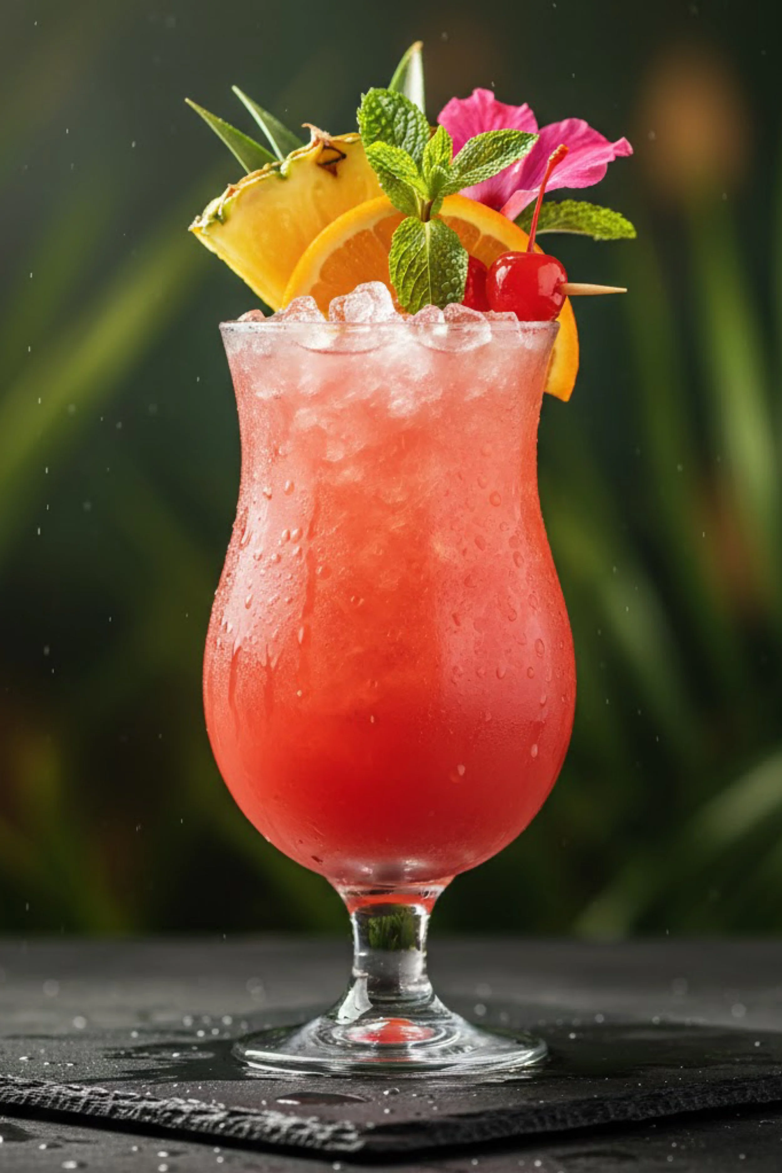 There’s a certain kind of drink that doesn’t just sit on the table—it changes the temperature of the moment. The Panty Dropper shows up like a neon whisper: coral-pink, glossy with condensation, piled high with ice that looks like it was chipped from a hotel bar at golden hour. In the glass, the color gradients from pale blush near the crown to a deeper ruby glow at the base, like it’s holding a small sunset captive. The first thing you notice is the garnish—almost theatrical. A bright pineapple wedge like a little flag of vacation, a curved orange slice glowing with citrus oil, a cherry lacquered red and glossy enough to look like candy, and a sprig of mint so green it feels electric. Then there’s the flower—soft, tropical, a kiss of magenta that makes the whole thing feel dressed for an evening it doesn’t intend to end early.