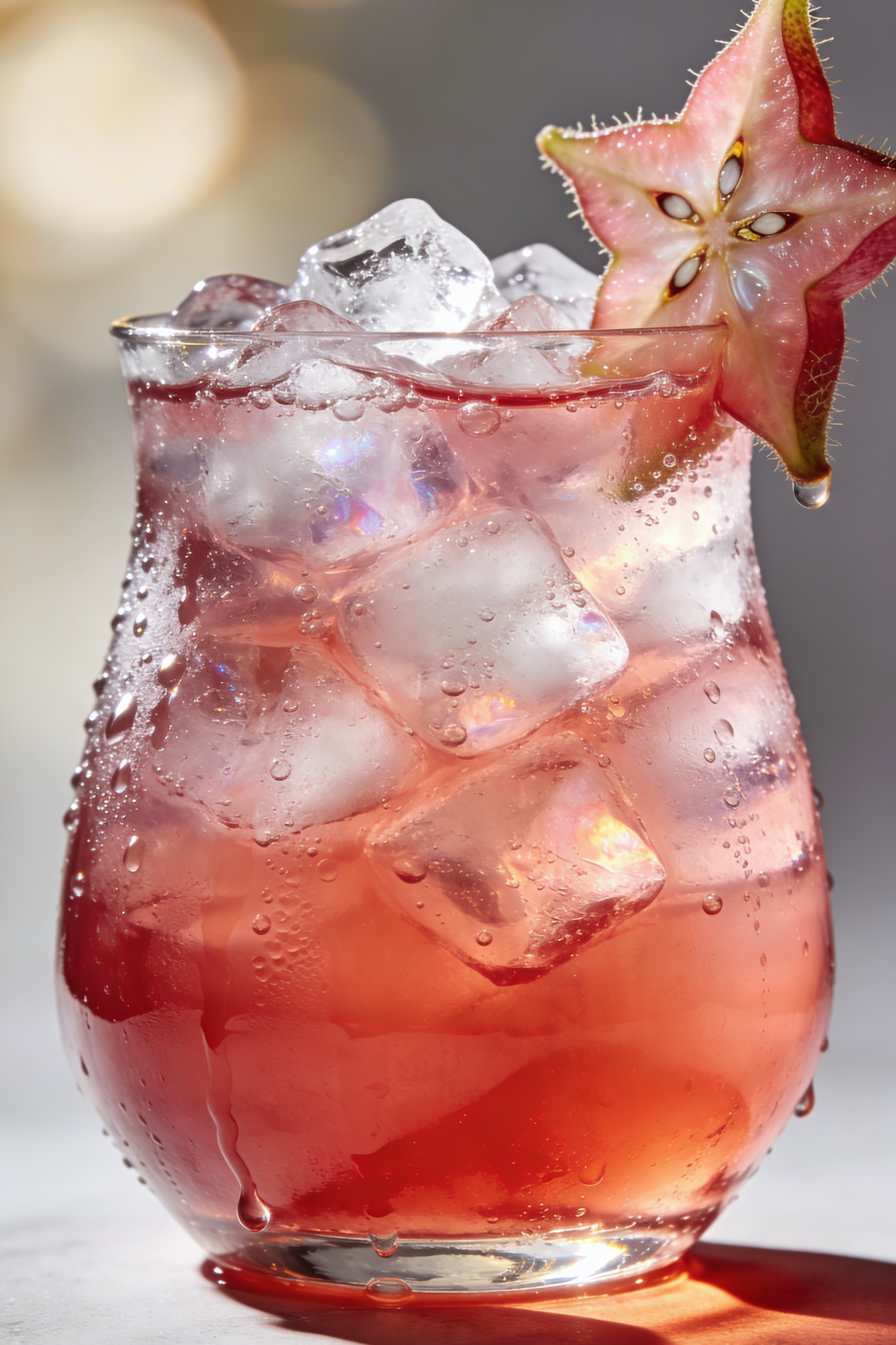 The second version is quieter but somehow more intimate, served low and close, like it’s inviting you to lean in. The ice is bigger, brighter, faceted like crystal, catching little rainbow flares in the light. A slice of starfruit clings to the rim, its five-pointed shape looking almost unreal—part garnish, part jewelry. The drink itself is still pink, still flirtatious, but cleaner around the edges, like a polished secret. Together, the two glasses tell the same story with different pacing: one is the loud laugh across the patio, the other is the smirk you catch when the music dips.