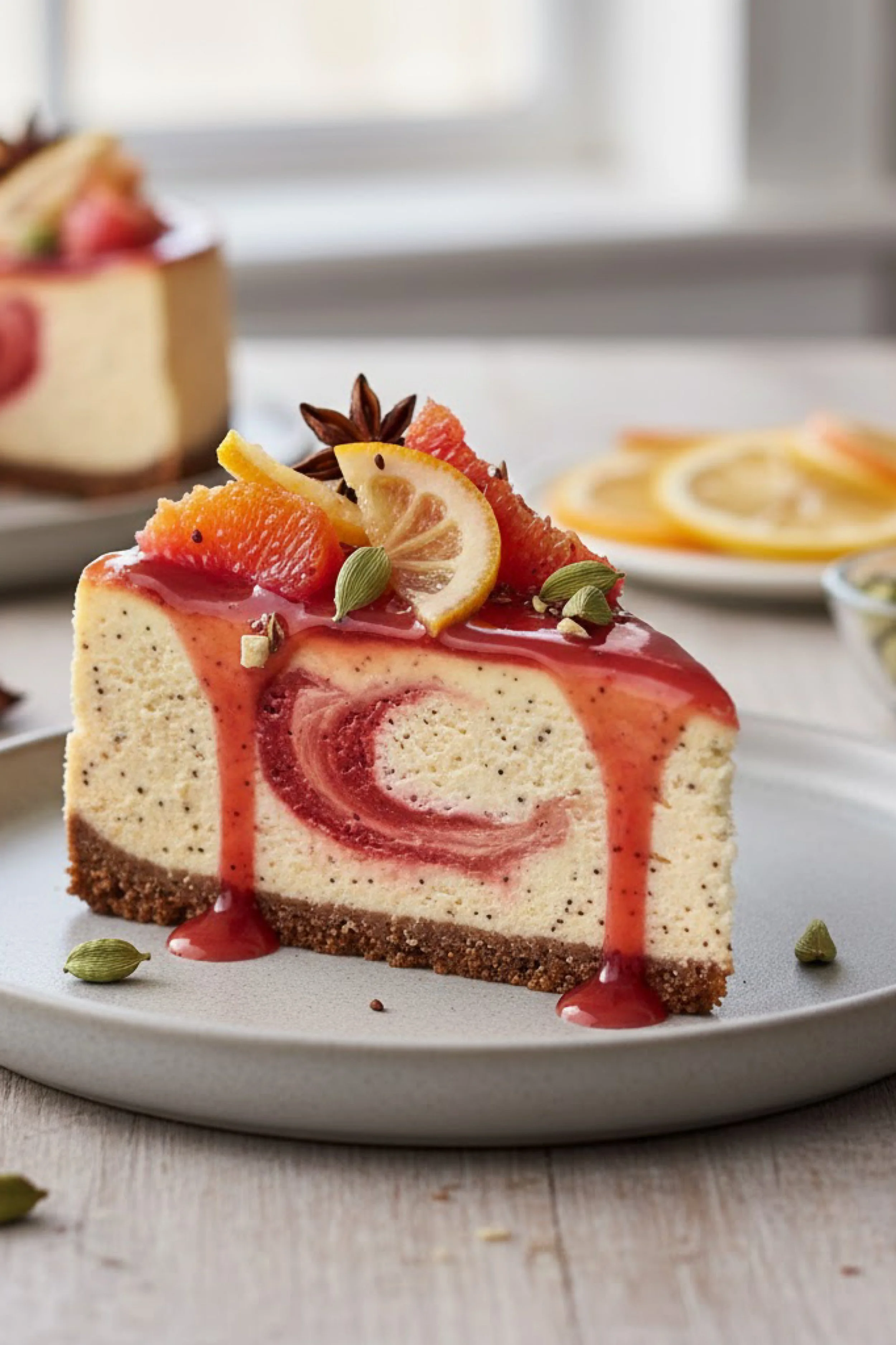 Variations keep the recipe feeling personal. Swap grapefruit for orange. Replace berries with a cherry puree. Add a little ginger to the crust. Trade poppy seeds for black sesame for a deeper, nuttier look. The core stays the same. A creamy base, a bright lift of citrus, a warm floral spice note, and a swirl that makes every slice feel like its own moment.