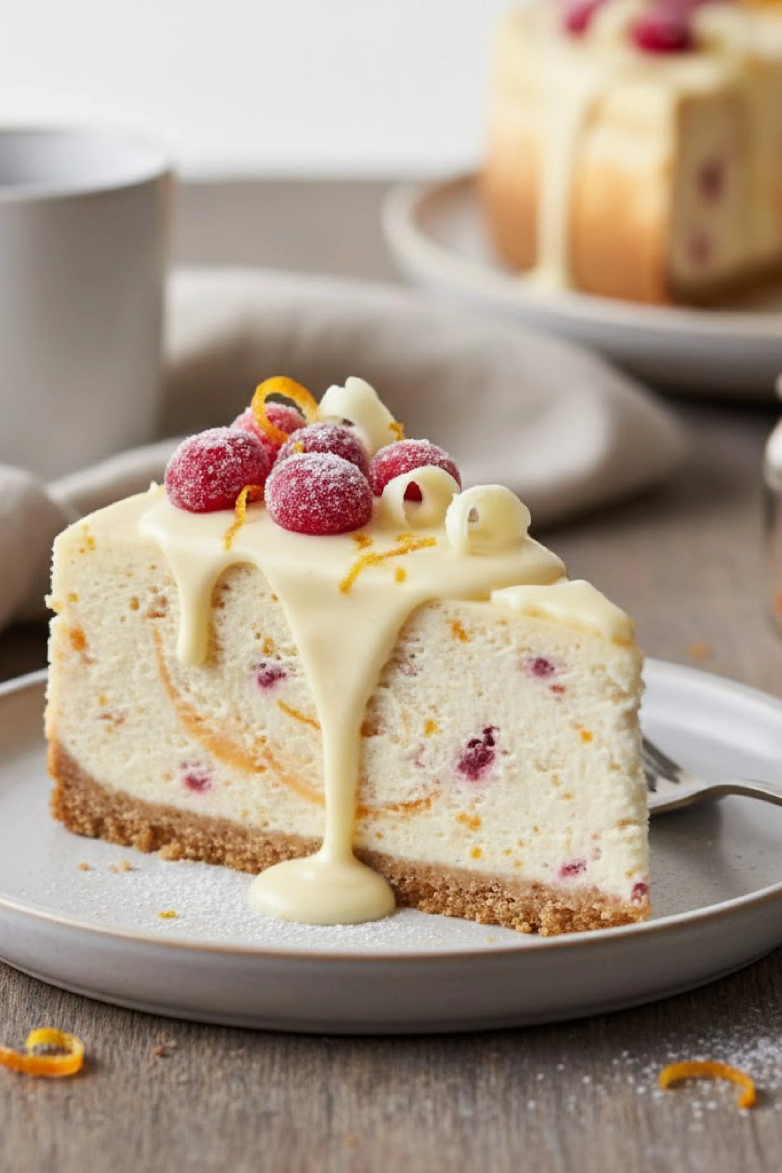 The first thing that hits is the glow. Not loud, not neon, just that creamy, candlelit sheen of a cheesecake slice that looks like it has been holding onto warmth on purpose. A pale ribbon of citrus swirls through the center like a soft brushstroke, and little cranberry jewels are tucked inside, as if the cake decided it wanted secrets. On top, a white waterfall of glaze spills down the edges and pools on the plate in the most unapologetic way, glossy and slow, the kind of drip that makes the whole room feel quieter for a second. Sugared cranberries sit like frosted pearls, a dusting of sugar catching the light, with curls of orange zest scattered like confetti you only notice when you lean in.