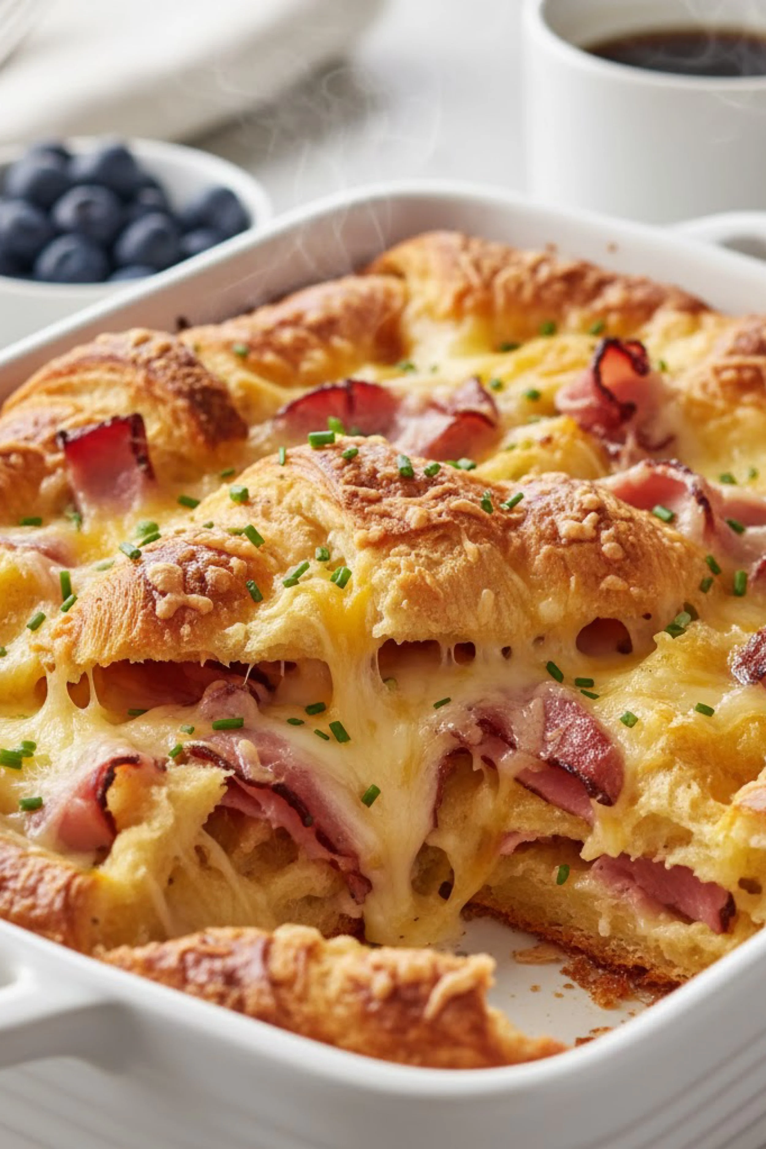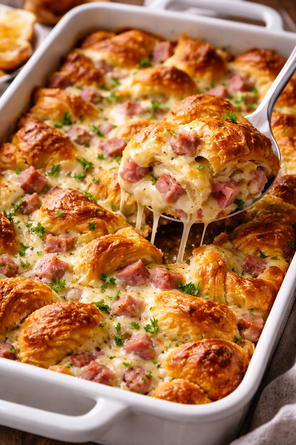 It is the kind of bake that feels like a secret you can set on the table. Not fancy for the sake of it, but rich in a way that makes the room go quiet for a second. You can smell butter and toasted pastry first, then the savory perfume of ham, then that comforting eggy steam that says everyone is about to eat well. A scoop lifts out and the whole pan looks like it is breathing, cheese sliding back into place, croissant layers separating into feathery ribbons.