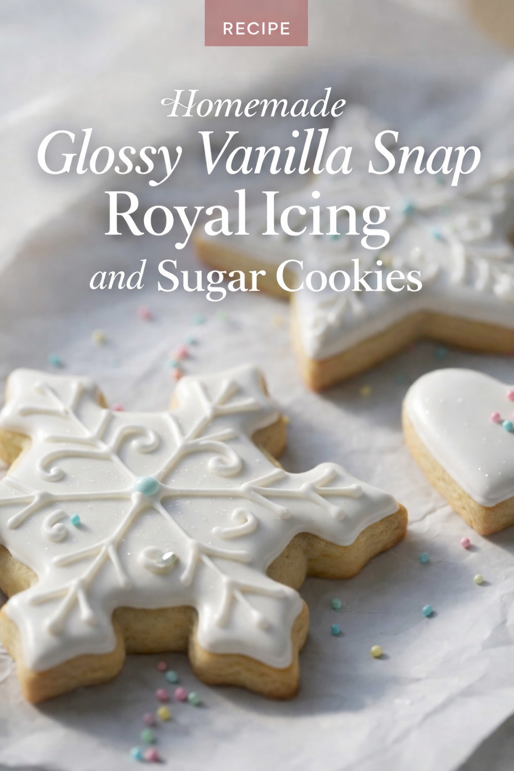 There is a certain kind of quiet that happens when a tray of sugar cookies cools and the kitchen turns into a little studio of light and patience. The kind of quiet that feels expensive, even if all you used was flour, butter, and a bowl. In the image, the cookies sit like tiny ornaments, crisp edged and tender centered, dressed in glossy white icing that catches the sun like porcelain. A snowflake cookie takes the spotlight, its surface traced with raised, scrollwork piping that looks like lace pressed into winter air. Nearby, a star waits in soft focus, and a simple heart cookie shines with a smooth, glassy finish. A few pastel sprinkles are scattered like confetti that forgot to leave, adding the smallest hint of color against all that creamy white.