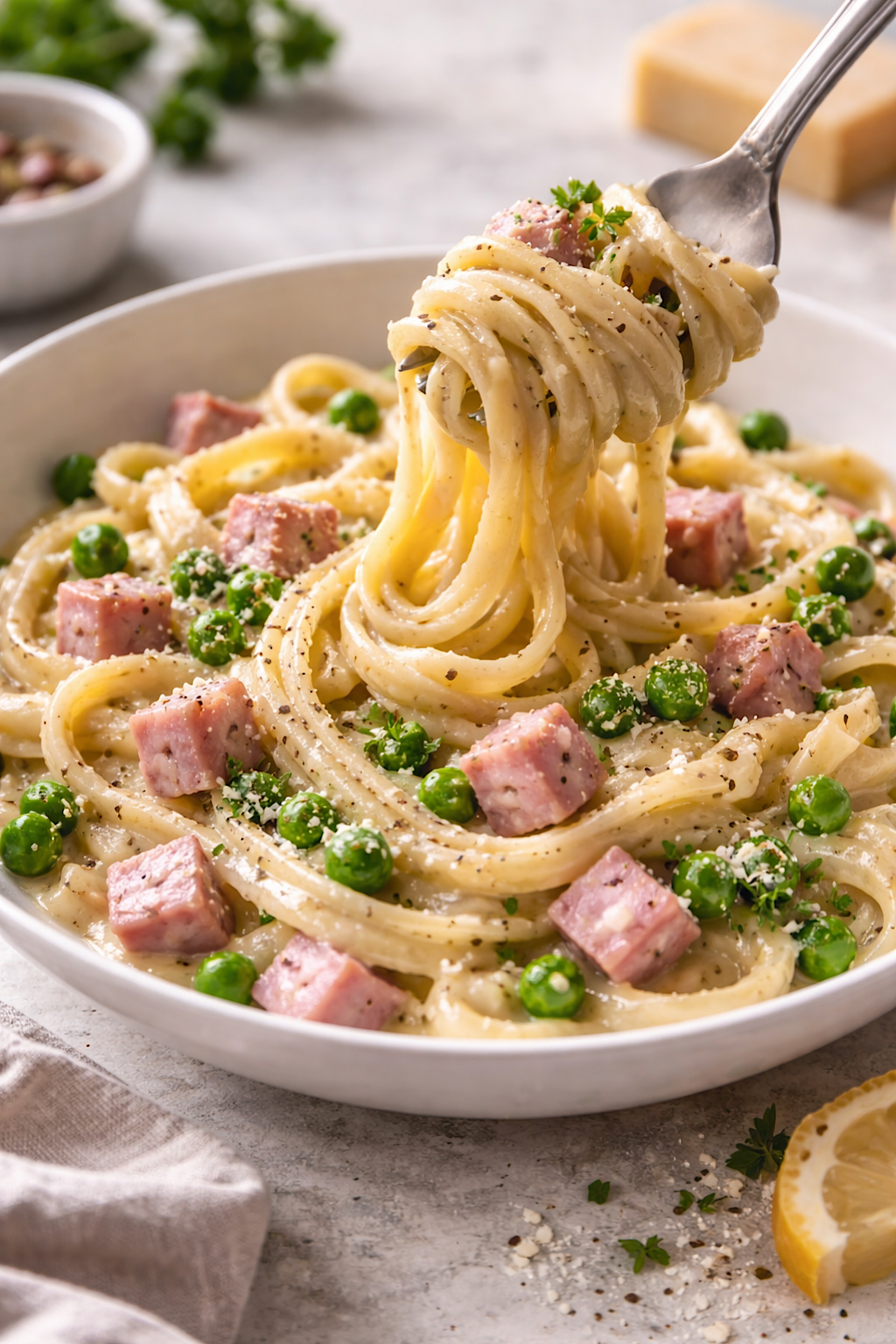 The first thing you notice is the gloss. A silken, pale gold sauce clings to every curve of pasta, pooling gently in the hollow of each elbow and wrapping itself luxuriously around long strands of spaghetti. Cubes of rosy ham are scattered like confetti across the surface, their edges soft yet defined, while bright green peas punctuate the scene with fresh, springlike vibrancy. A snowfall of finely grated cheese melts almost instantly into the warmth below, leaving behind a delicate dusting that catches the light. Black pepper freckles the cream, adding contrast and promise. In the background, a wedge of hard cheese rests beside a halved lemon, the citrus flesh glowing softly as if hinting at the brightness woven through every bite.