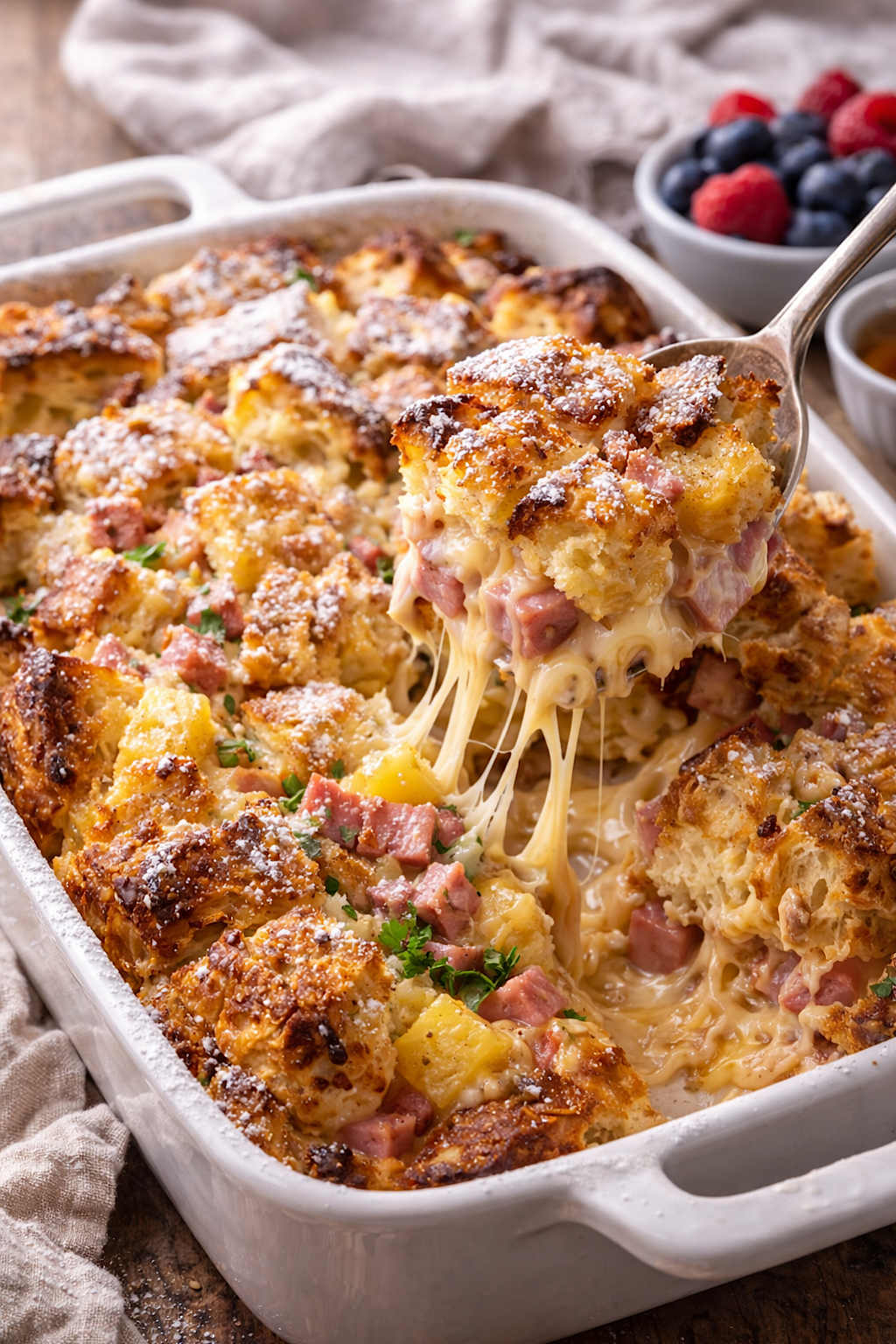 And then there is the topping energy. Some people go all savory, skip the powdered sugar, add mustard, keep it brunchy and grown up. Others lean into the contrast and serve it with syrup on the side, letting the salty ham and the sweetness play tug of war. If you love the fruit note from pineapple, you can echo it with a bowl of berries nearby, a bright counterpoint that makes the plate feel fresh. The image with the spoon lift and the berries in the background captures that feeling perfectly. It is cozy, but not sleepy. It is rich, but still inviting.