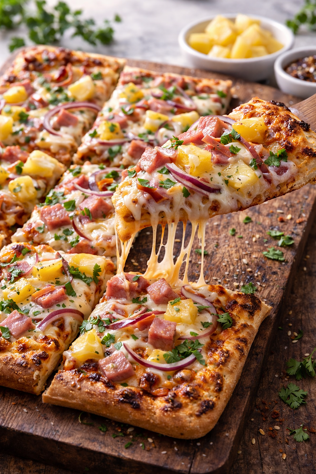 The image holds that exact moment. A thick sheet pan crust, baked until the perimeter turns golden and pillowy, frames a layer of sauce and cheese that looks like it melted into the dough rather than sitting on top of it. The toppings are classic and confident: cubes of ham with browned edges, pineapple rings and chunks that soften and caramelize, and a shower of fresh green herbs that brightens the whole surface. In the second scene, a slice lifts away and the cheese stretches into silky strands that refuse to let go. It is the kind of cheese pull that makes people stop talking for a second. The board underneath is rustic, the background is soft and casual, and the whole setup says this is meant to be shared, but no one would blame you for guarding the last slice.