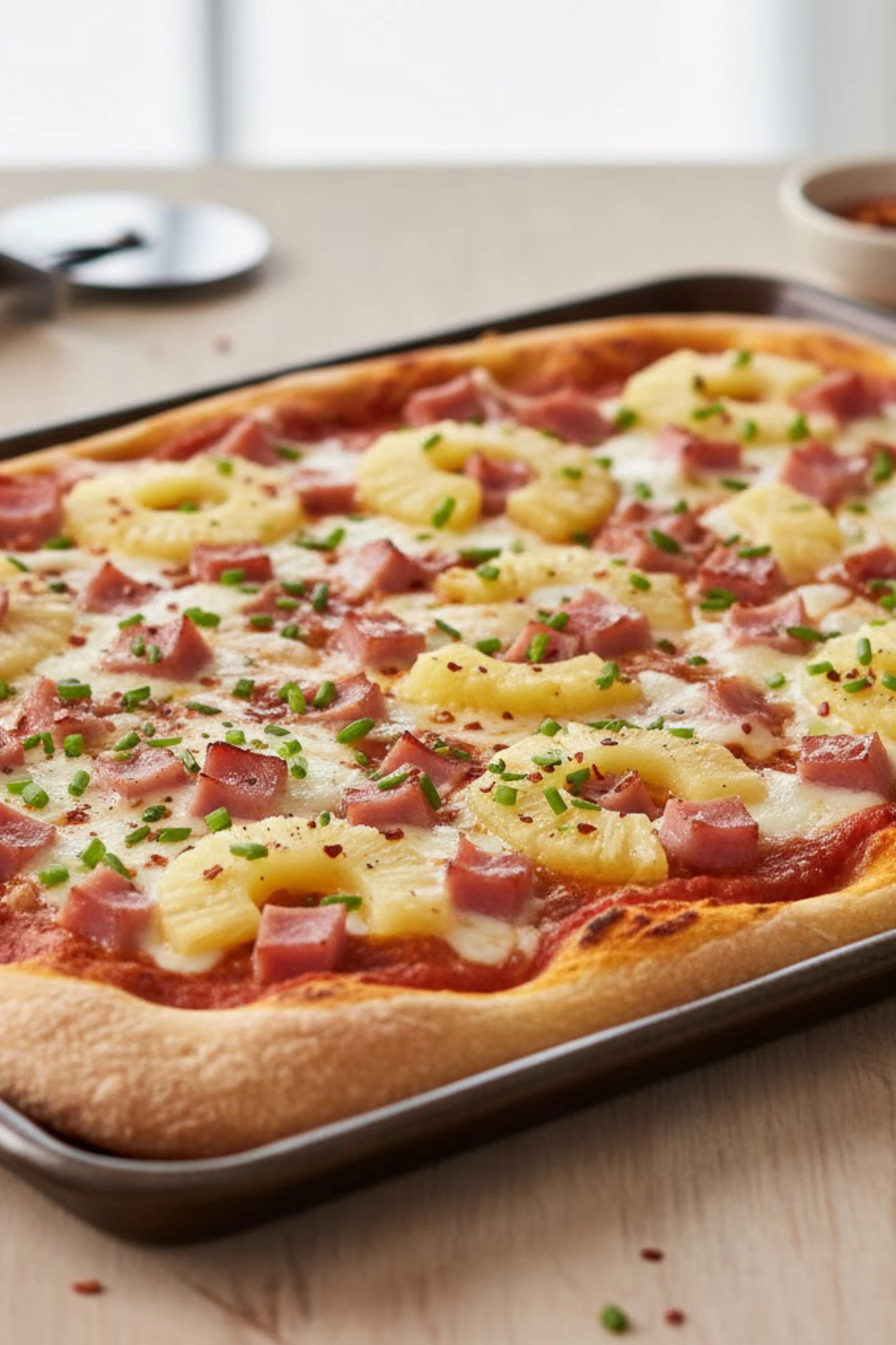 The aroma is the first promise. Yeast and toasted flour as the crust bakes, then the sweet scent of pineapple warming and caramelizing, then the salty richness of ham as it browns around the edges. When it comes out, the cheese is still bubbling, the surface is speckled with herbs, and the corners are audibly crisp when you tap them. That crisp corner is part of the charm, because sheet pan pizza gives you both textures in one bite: the crunchy edge and the soft center. A good pizza cutter wheel for clean squares turns the whole thing into neat slices that still feel casual, like the best kind of party food.