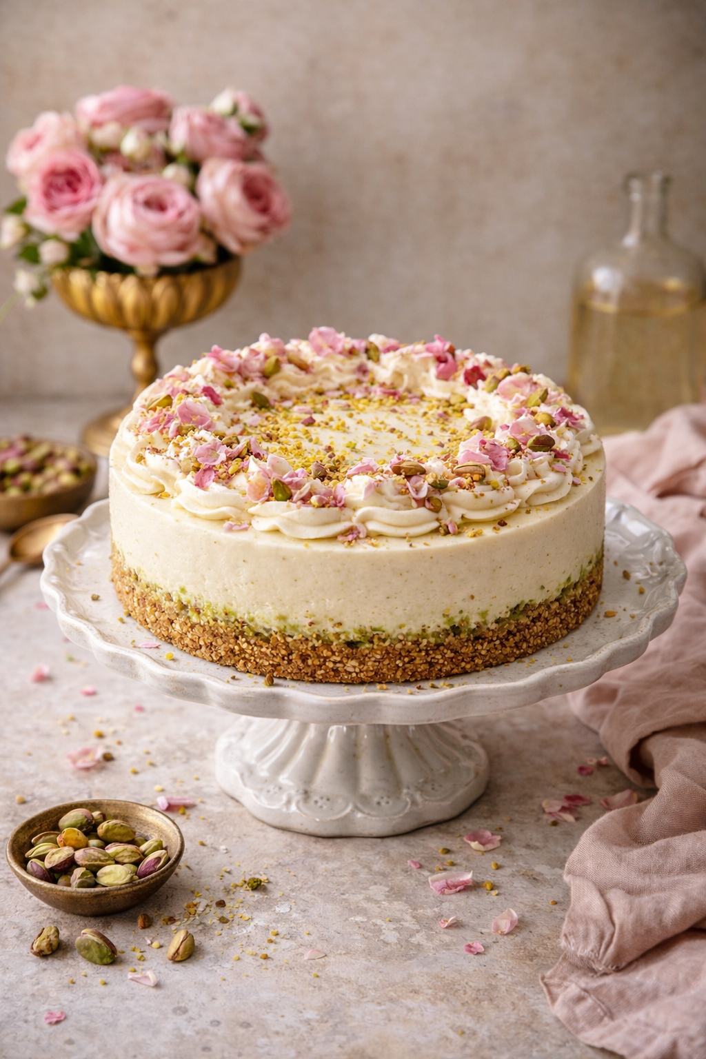A creamy, floral-leaning cheesecake with a pistachio-forward crust and an elegant whipped topping.