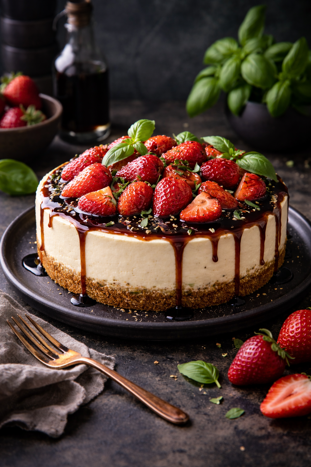 A creamy baked cheesecake with a crisp cookie crust, topped with strawberries, basil, and a glossy balsamic-chocolate drizzle.