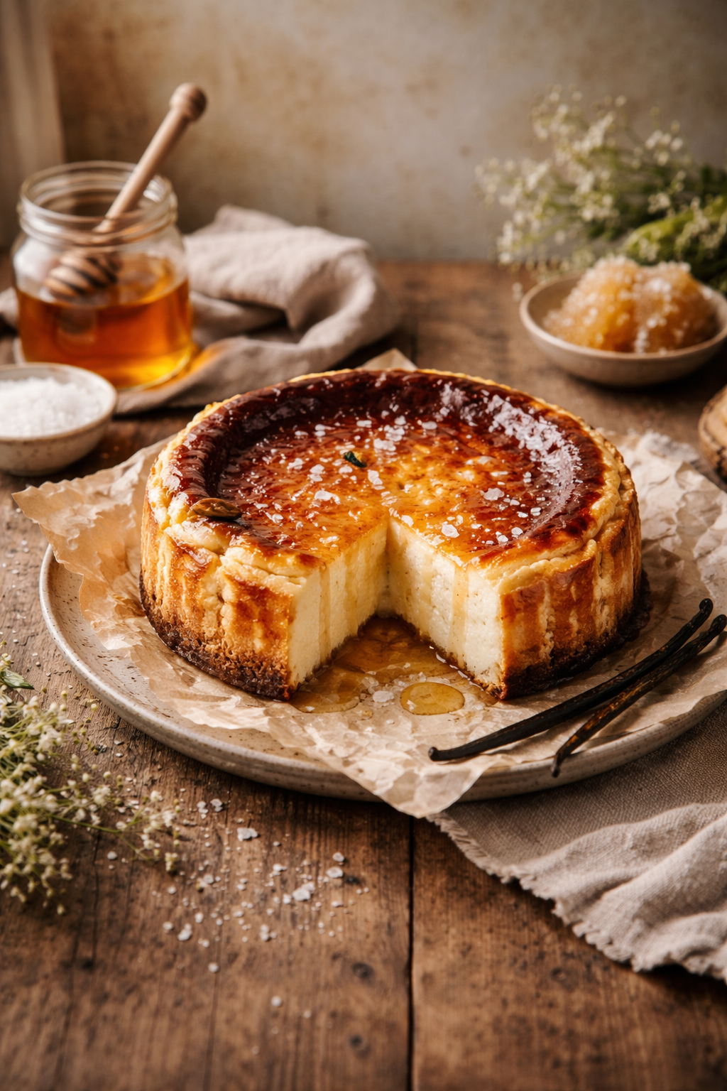 A tall, creamy vanilla bean cheesecake finished with a caramelized crackle top, warm honey drizzle, and flaky sea salt.