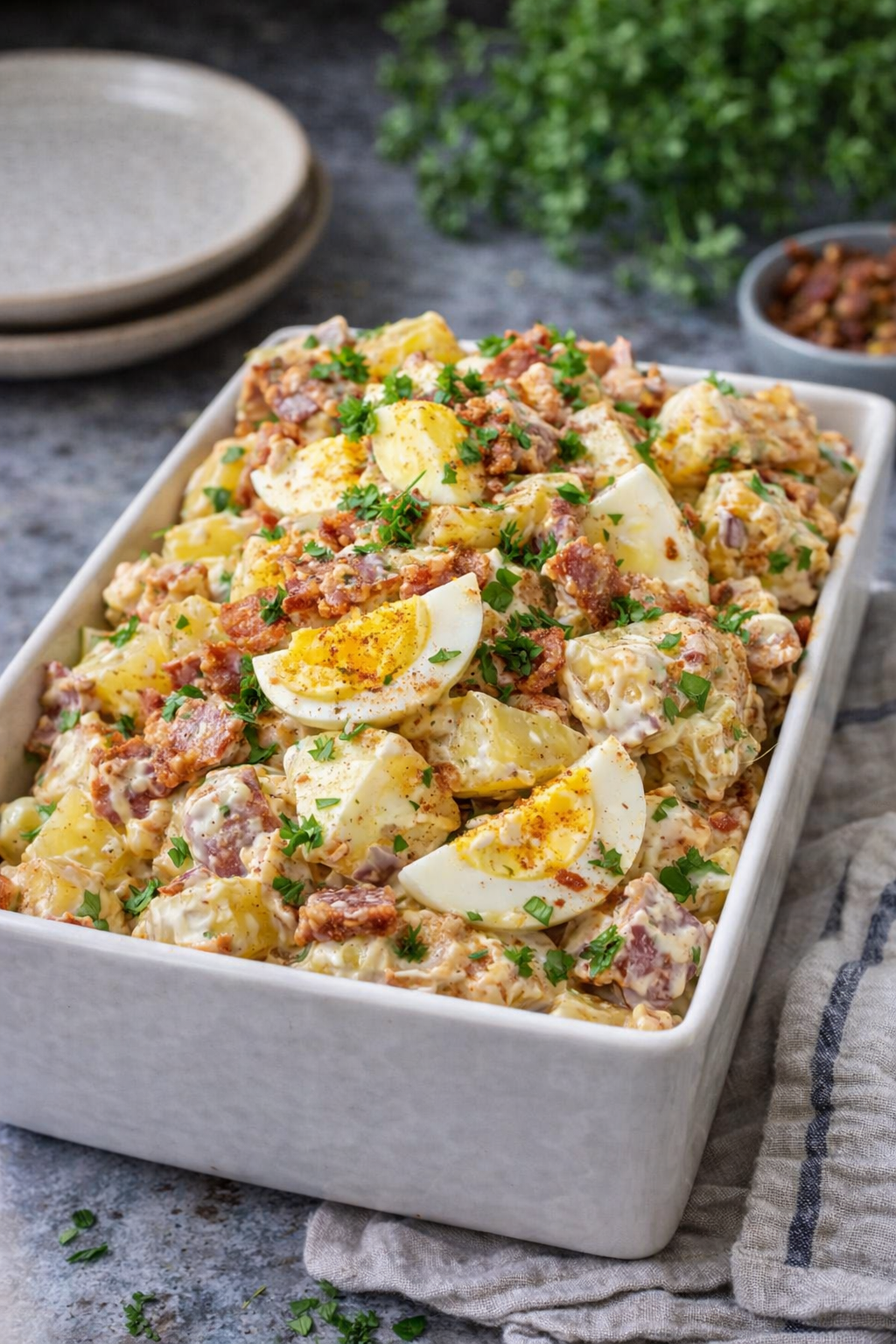 There’s a certain kind of silence that settles over a kitchen when something truly irresistible hits the counter—no fanfare, no announcement, just the subtle shift of attention as everyone’s eyes find the same place. A big white dish, heavy with promise. Potatoes cut into generous chunks, their edges softened into that perfect “just-tender” texture, wearing a creamy coating that looks like it was stirred with patience instead of urgency. Hard-boiled eggs sit on top in bright wedges, their yolks a warm gold against the pale dressing, like little sunbursts tucked into the folds. Crispy bacon is scattered everywhere, the pieces catching light and adding that toasted, smoky crunch that makes people take a second look. A dusting of paprika (or something close to it) warms the surface with color, and fresh green herbs—parsley, likely—lift the whole dish with the kind of clean, garden-fresh fragrance that keeps rich food from feeling heavy.