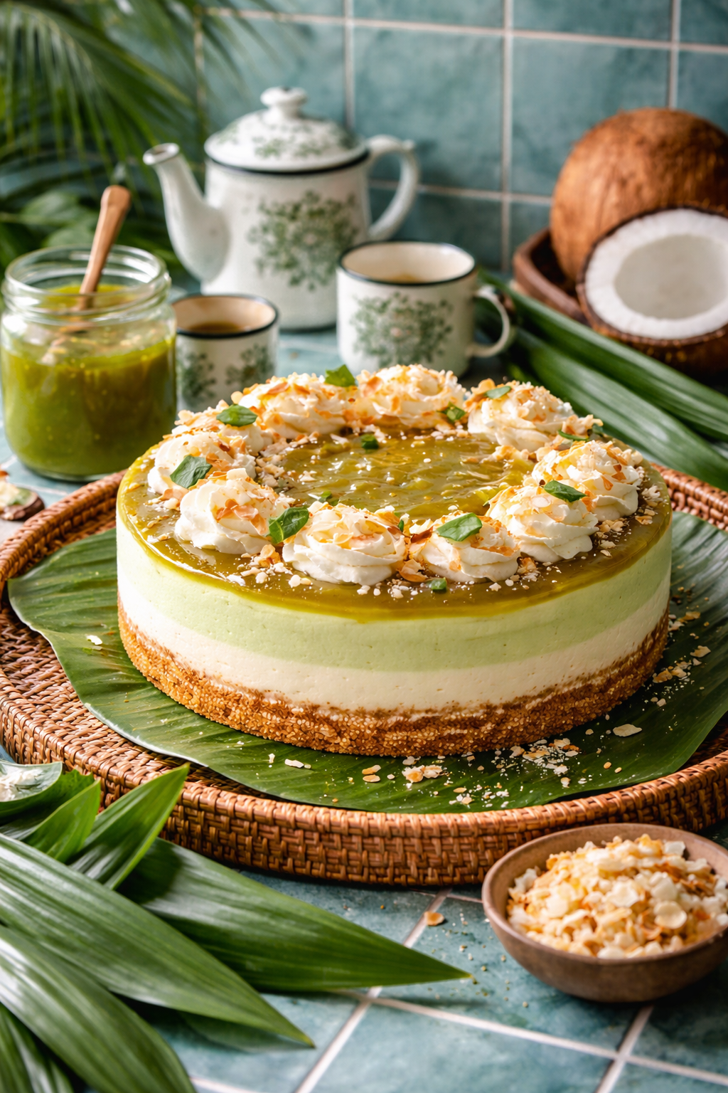 The setting completes the illusion: broad leaves framing the cheesecake like a centerpiece on a veranda table, woven rattan underneath, and a tiled backdrop that looks cool to the touch. Even the props feel like part of the flavor—an old-world teapot and cups, a jar of vivid green sauce with a spoon still resting inside, a halved coconut waiting patiently nearby. It’s the kind of tableau that suggests slow time: afternoon light, a fan turning lazily, the air smelling faintly of toasted coconut and something floral you can’t quite name until your brain lands on pandan—vanilla’s more intriguing cousin, grassy-sweet and softly nutty, with a perfume that belongs to warm climates and open windows.