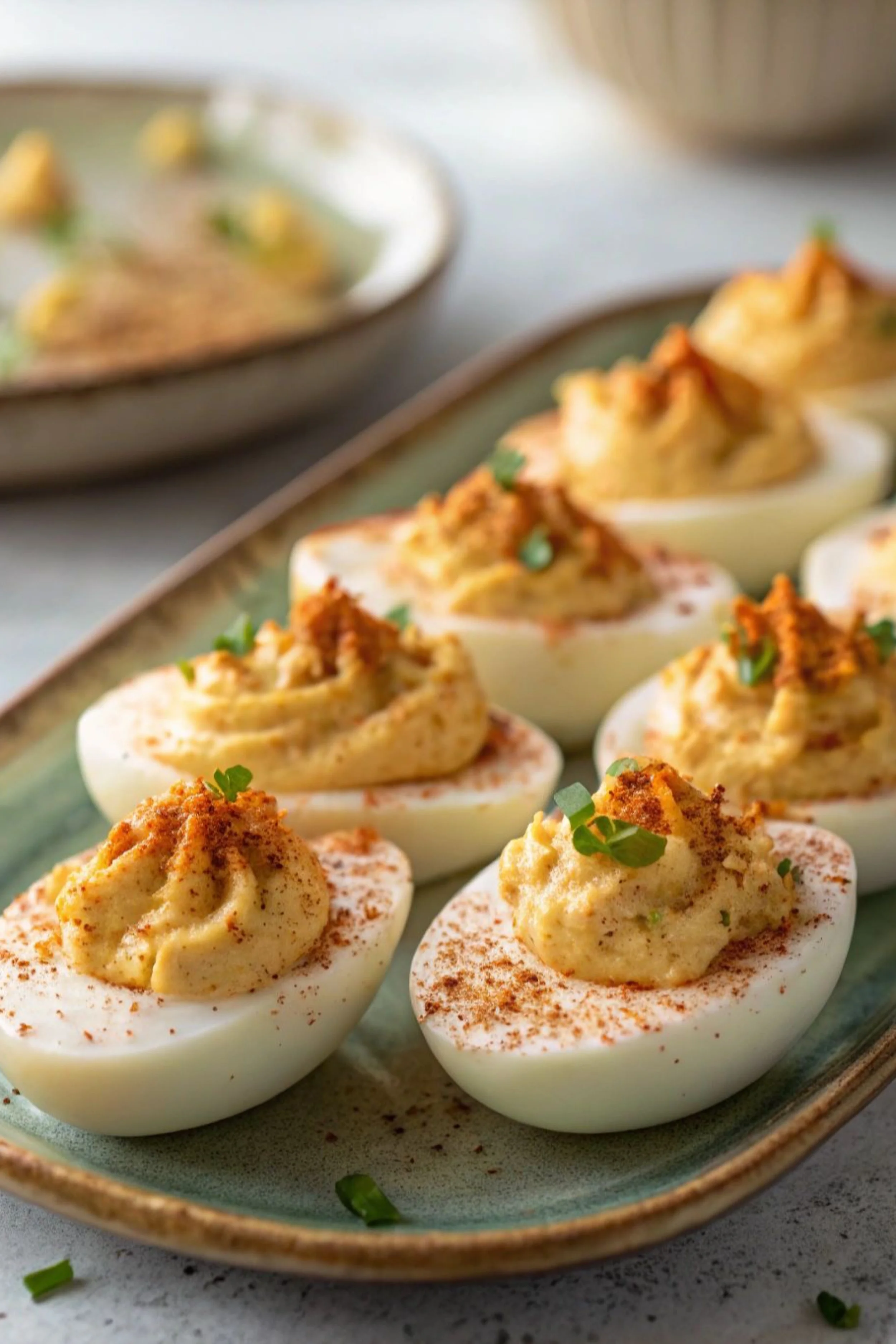 There’s a certain kind of calm that lives in food made to be picked up—one perfect bite at a time—especially when it arrives dressed like it meant to be photographed. Deviled eggs do that without trying. The whites sit like polished porcelain, cool and bright, while the filling rises in soft, golden mounds that look whipped rather than stirred. In the scene, everything is gentle: a green stoneware platter with a warm rim, a scatter of paprika dust like sunset grit, tiny flecks of herbs catching the light. The background falls out of focus the way a kitchen does right before guests arrive—quiet, tidy, waiting.