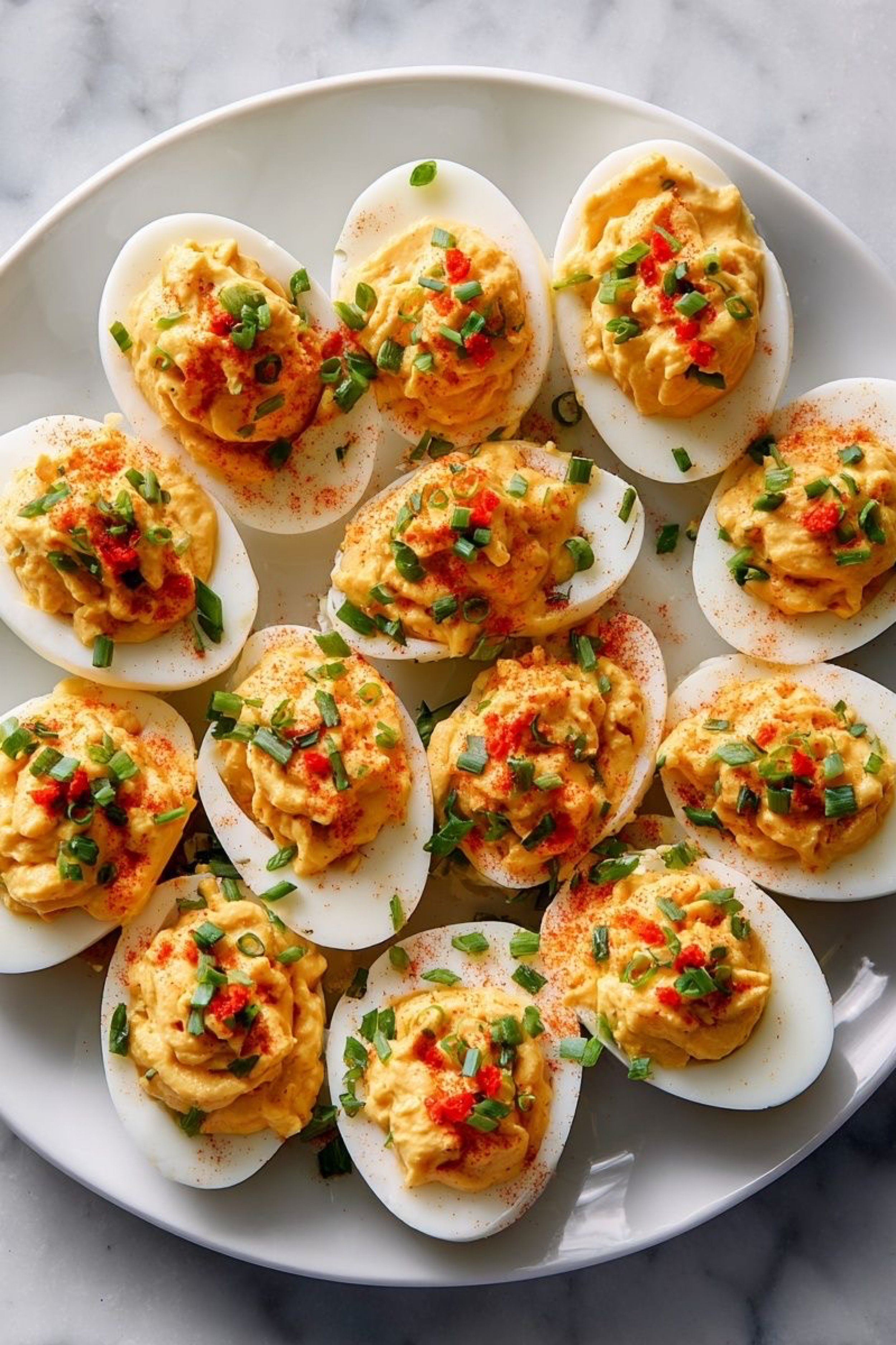Deviled eggs are at their best when the filling is whipped smooth, seasoned with intent, and finished with a fresh, bright garnish. This version leans classic—mayo, mustard, and a touch of acid—then gets a clean lift from chives and a warm paprika finish.