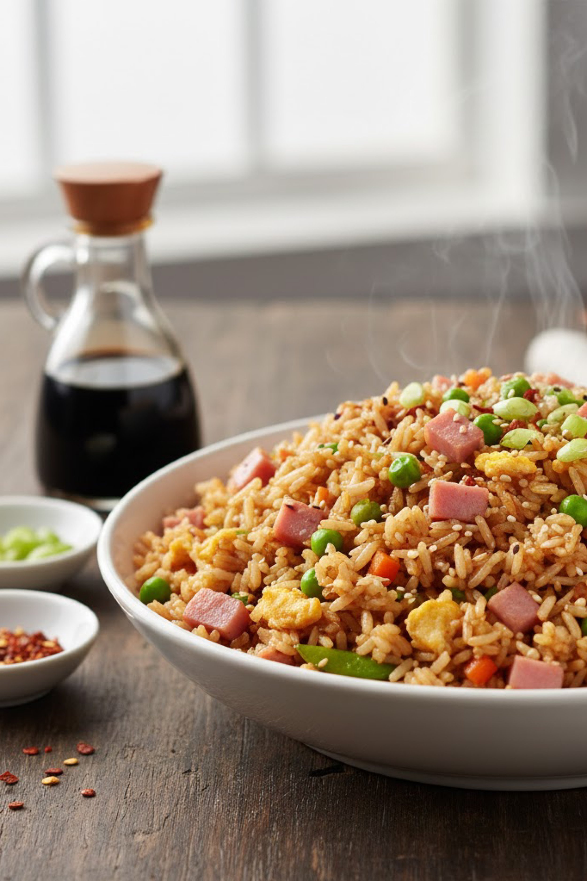 Steam curls up from the bowl in soft ribbons, catching the light just enough to make everything look warm, lived in, and irresistible. The rice is glossy and bronzed, each grain separate and lightly slicked with savory sauce. Bright peas sit against cubes of pink ham like little pops of color in a dish that already feels comforting before the first bite even lands. There are bits of carrot for sweetness, tender folds of egg for richness, and that unmistakable fried rice aroma that seems to fill a whole kitchen in seconds. Off to the side, a dark bottle of soy sauce waits quietly, while scattered seasonings on the table hint at how easily a plain bowl of leftover rice can be turned into something that feels satisfying, complete, and just a little addictive.