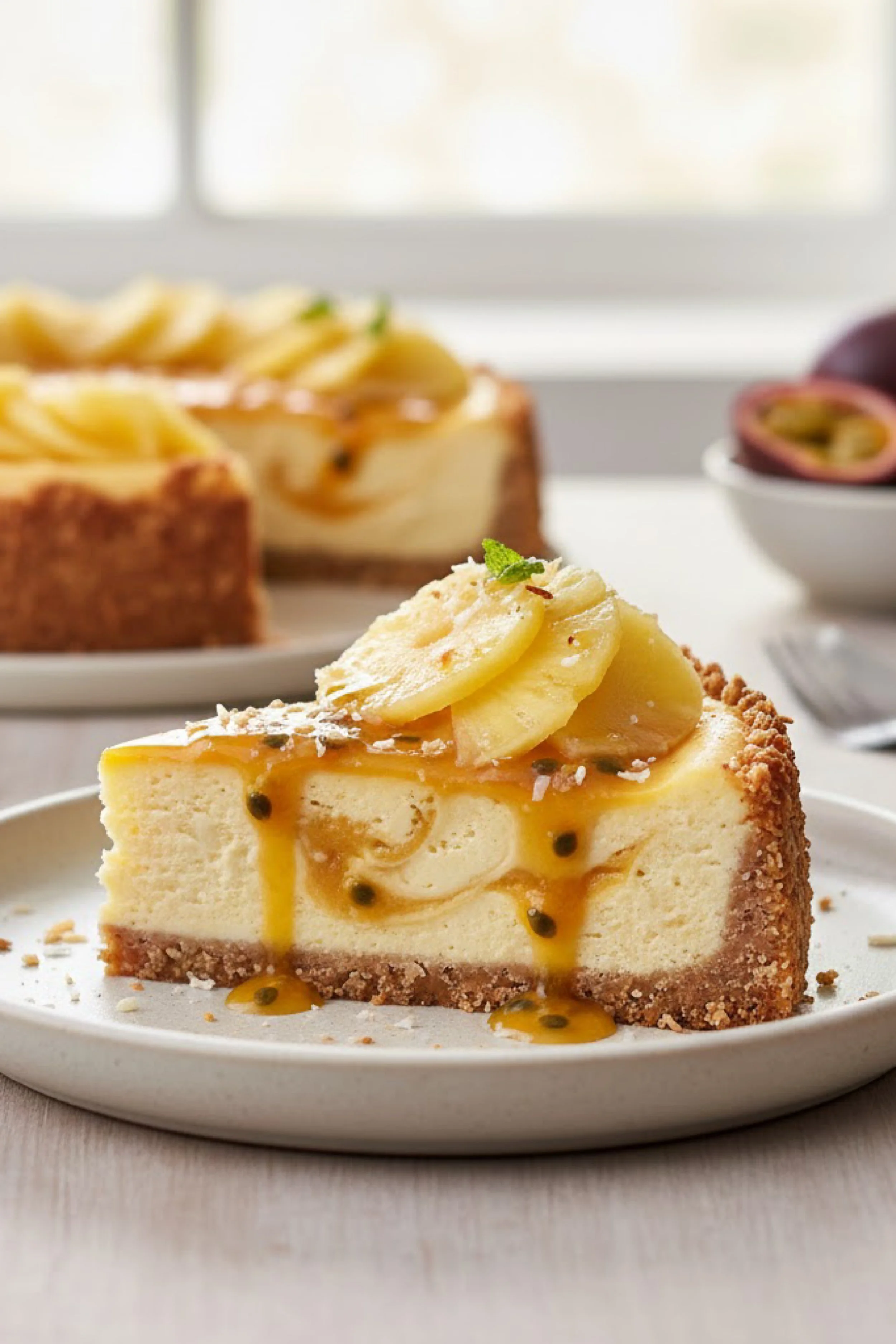 The beauty of a dessert like this is the contrast it promises before the first bite even happens. Cheesecake is known for richness, density, and that luxurious creaminess that lingers slowly. Pineapple and passion fruit bring the opposite energy. They are bright, fragrant, vivid, and alive with acidity. Together they create a kind of dessert tension that makes every forkful more interesting than the last. The creamy filling settles on the palate with that familiar velvety calm, then the fruit cuts through with sparkle and fragrance, waking everything back up again. It is the kind of combination that feels polished enough for a dinner party yet joyful enough for a weekend when you simply want your kitchen to feel beautiful.