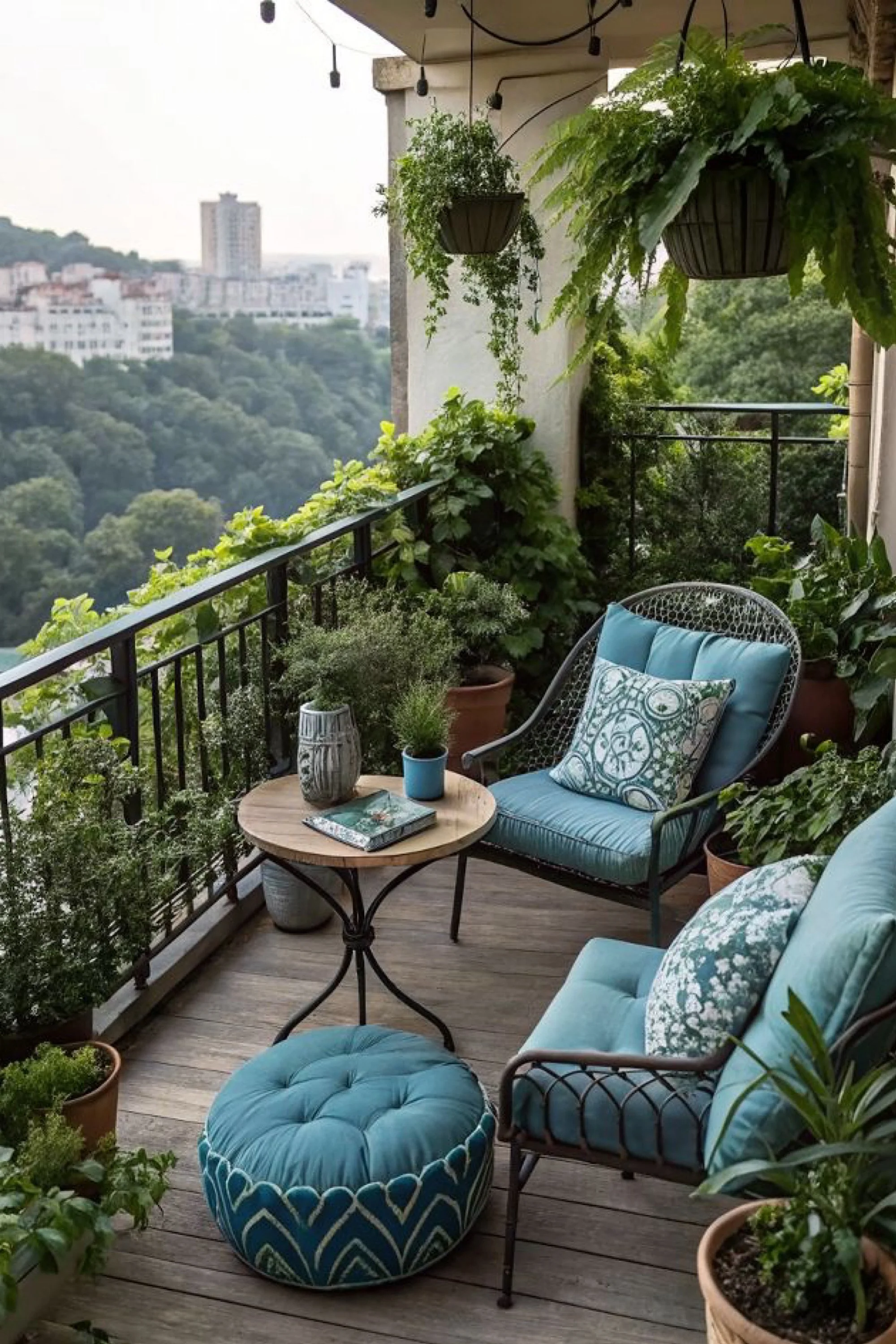 With a backdrop of treetops and rolling hills, this cool-toned balcony feels like a private escape. A black metal-framed sofa and chair are fitted with teal cushions and patterned pillows that echo the shades of sky and forest. A tufted ottoman doubles as extra seating, while a small wooden-topped table holds ceramics and books for leisurely afternoons. Hanging planters and an abundance of potted herbs complete the look, making it as functional as it is beautiful.