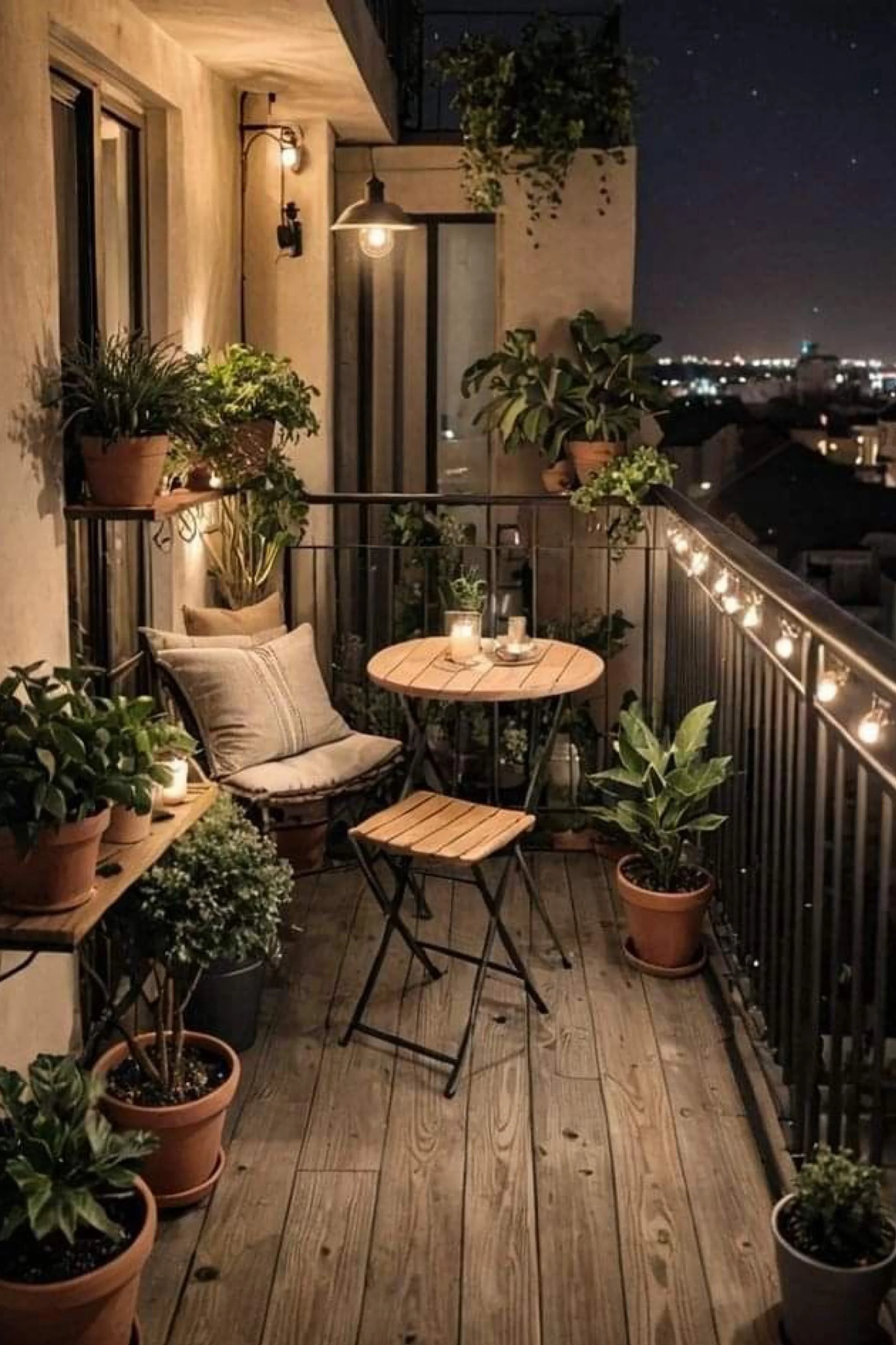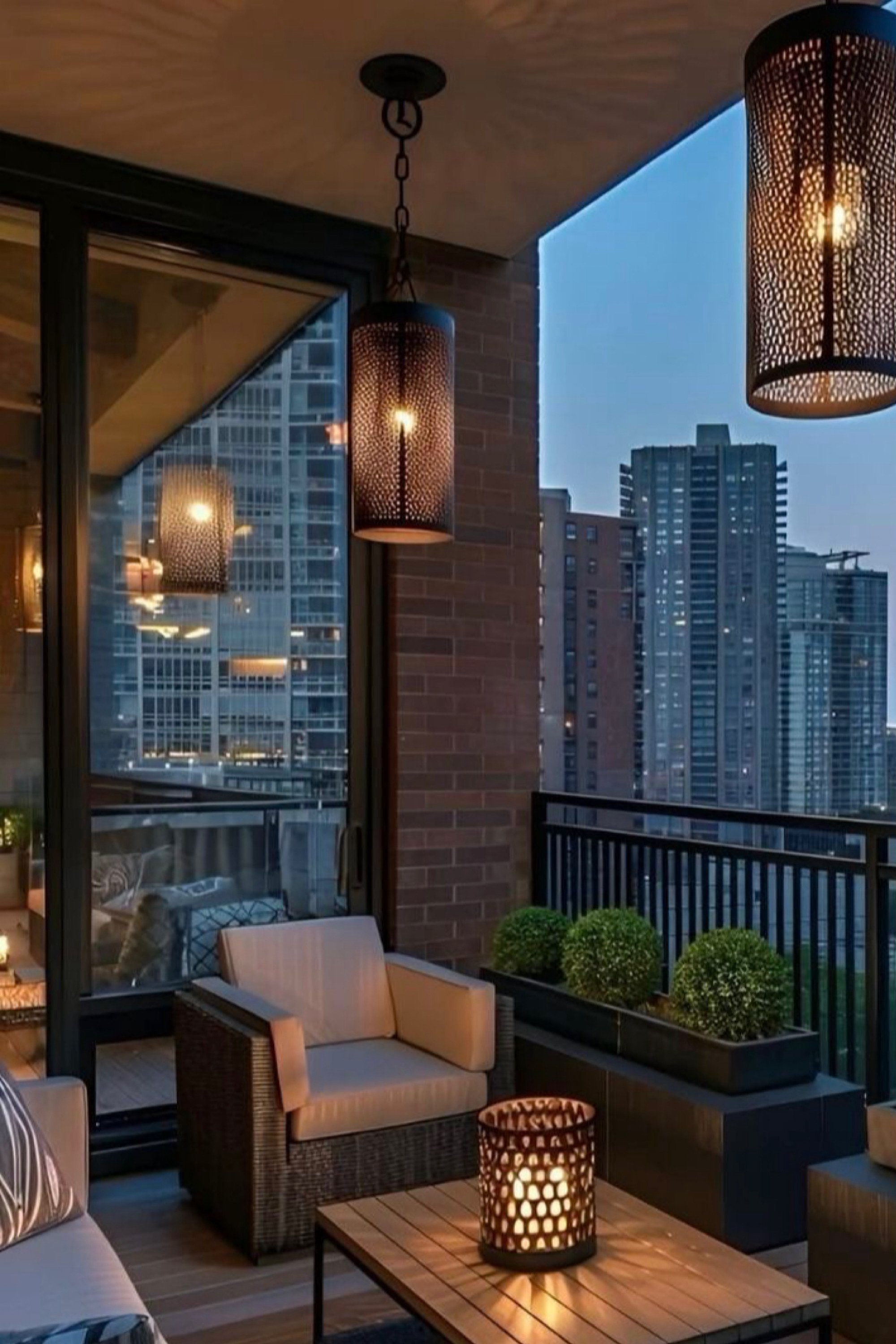 Daytime terrace gardens are beautiful, but the transformation at night can be pure magic. Lighting is where boho style excels, with its mix of practical illumination and decorative sparkle. String lights along the railing cast a warm glow, lanterns placed on the floor or tables create pools of light, and candles (real or battery-operated) add a flicker that softens the urban backdrop.