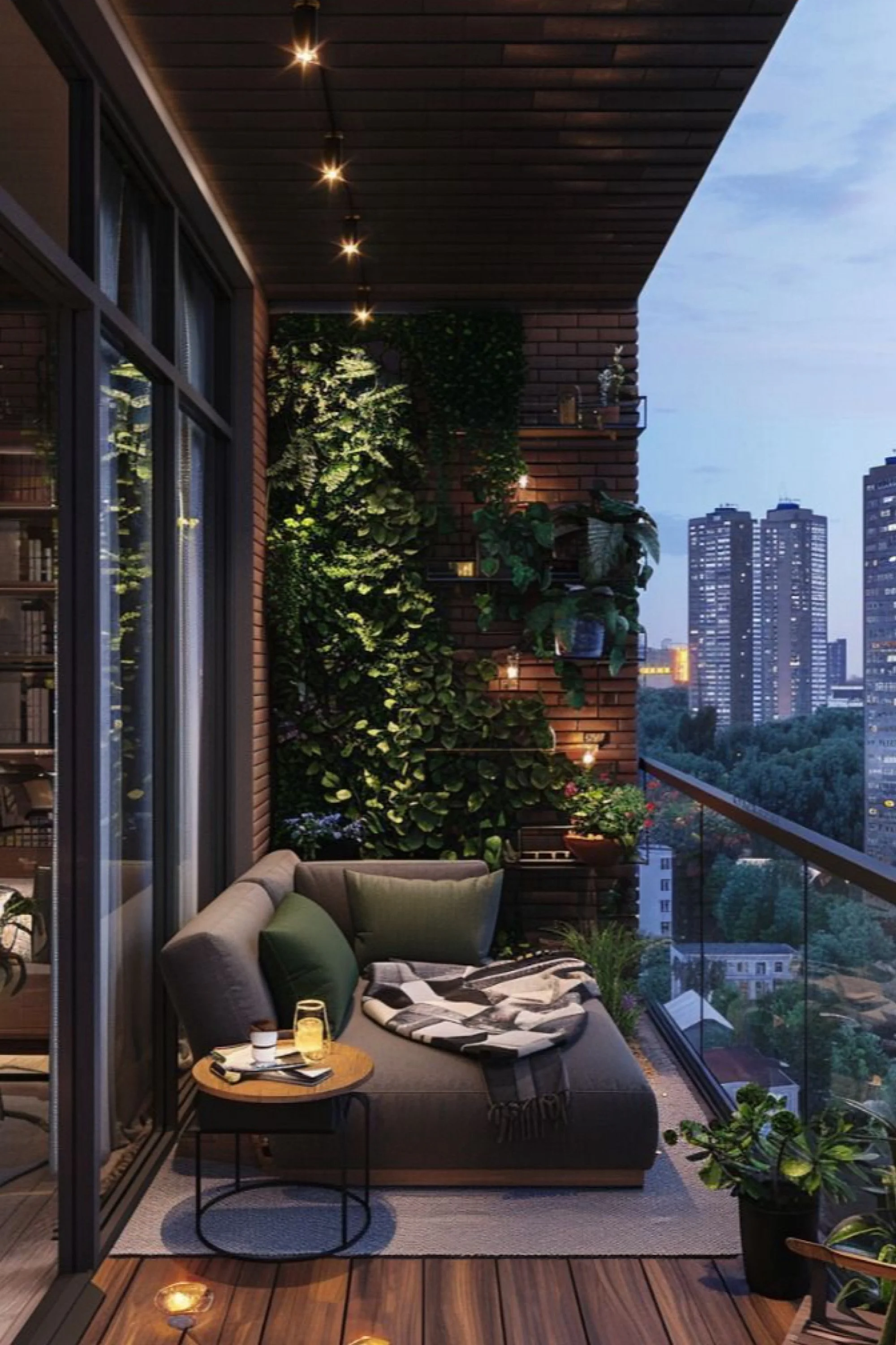 This sleek urban terrace is a celebration of greenery and modern comfort. A plush sectional in deep olive tones anchors the space, positioned to take in sweeping skyline views. The star feature is the lush vertical garden wall, climbing up rich brickwork and adding a natural, grounding presence to the balcony. Warm, minimalist track lighting overhead casts a soft glow, while a small round side table keeps essentials close — from morning coffee to evening cocktails. The glass railing keeps the view unobstructed, creating a perfect blend of city energy and private tranquility.