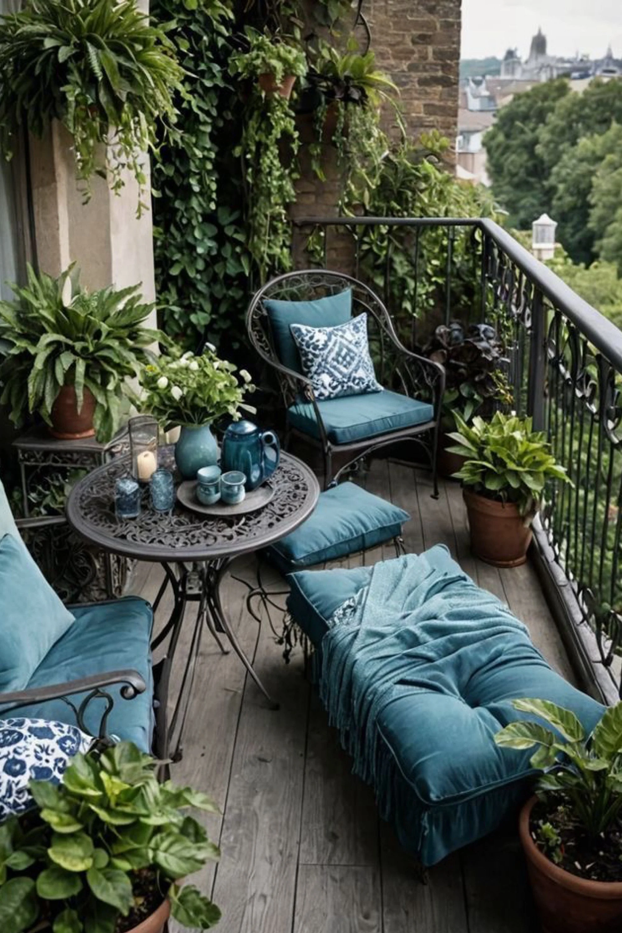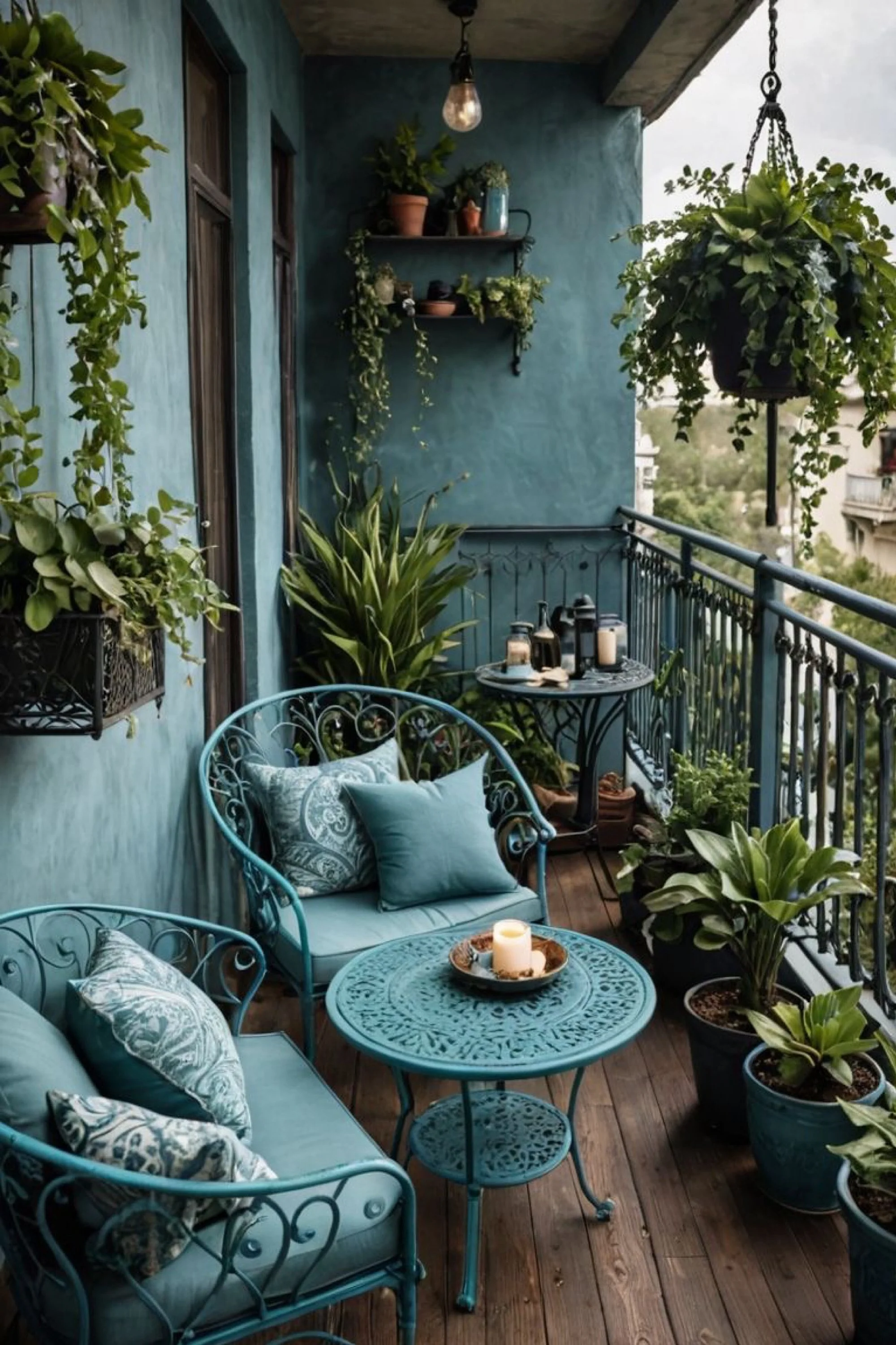 This teal-hued balcony is a stunning statement in color coordination. From the painted walls to the ornate metal bistro set, every detail exudes Mediterranean charm. Cushions in a harmonious mix of solid teal and patterned paisley echo the theme, while an array of potted greenery frames the space with life. Hanging planters and wall-mounted pots add vertical texture, creating layers of foliage. The candle centerpiece on the table provides a warm glow for evening relaxation, making this a dreamy escape right at home.