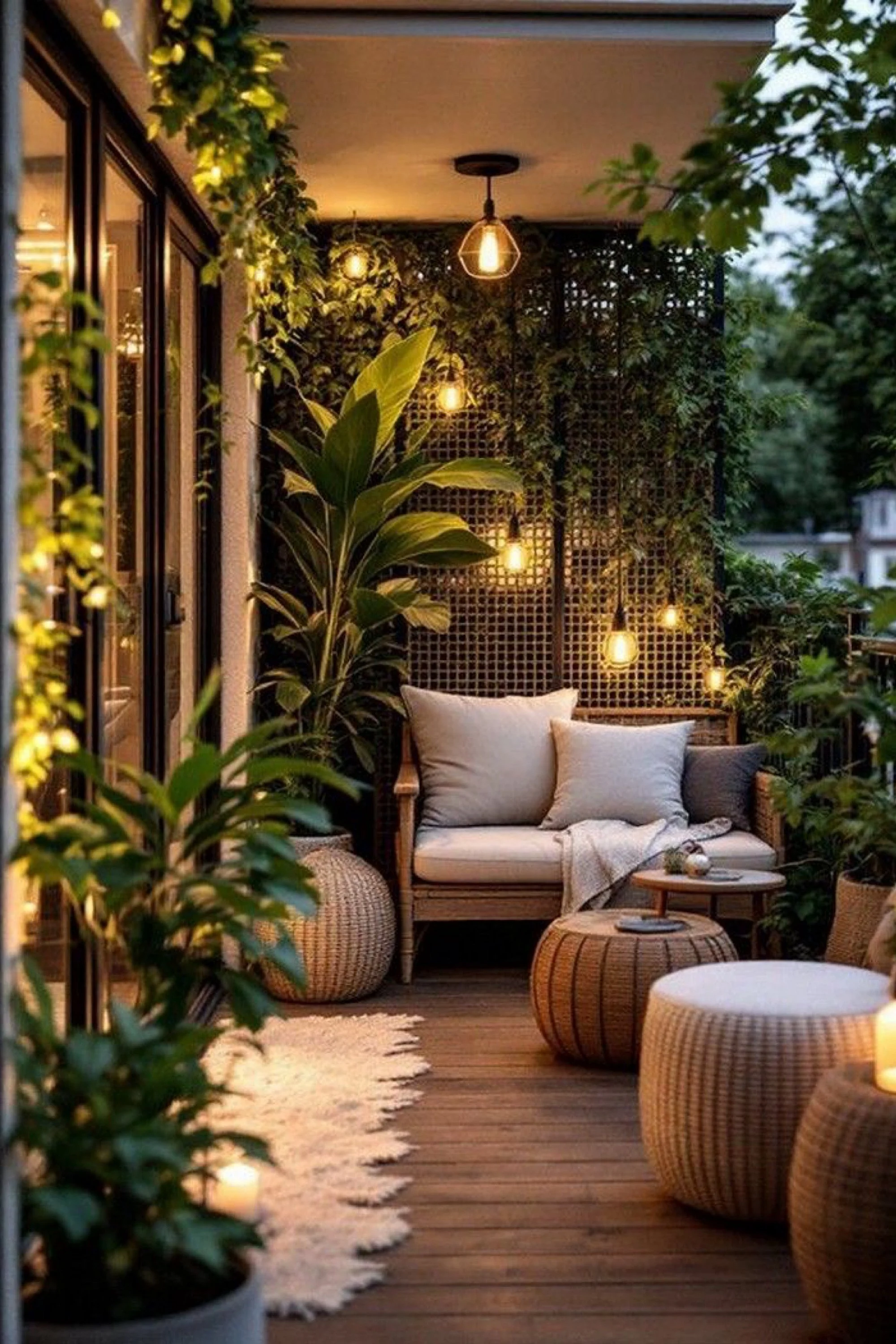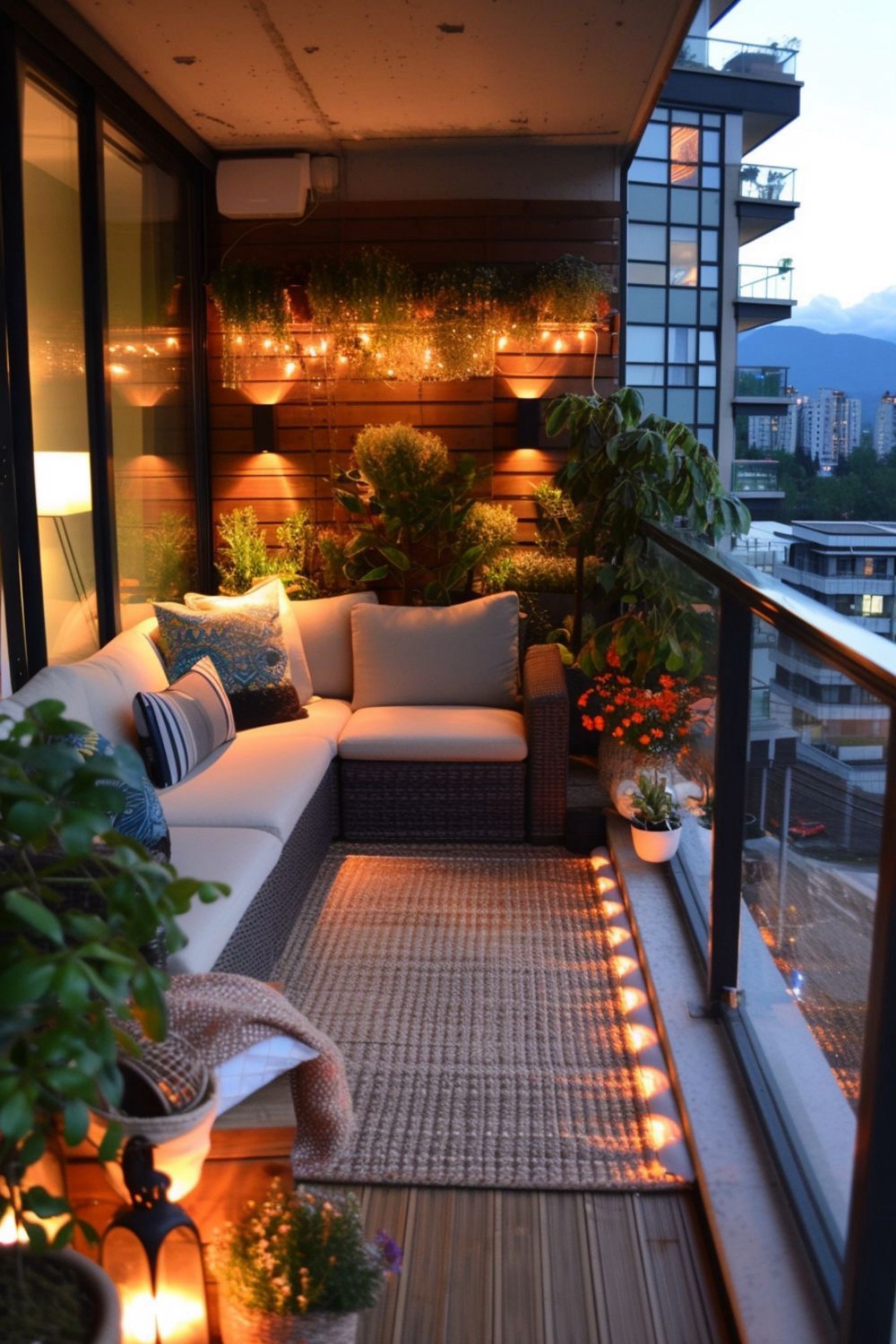 This long, narrow balcony feels like a secret retreat tucked into the city. Climbing vines frame the walls, dotted with Edison bulb string lights that glow like suspended fireflies. A cozy two-seater rattan loveseat sits beneath the canopy of greenery, softened with pale cushions and a draped knit throw. Low woven ottomans double as tables, creating flexible, easy-going functionality. The wooden decking feels warm underfoot, and candles flicker from discreet corners, casting a golden light that plays with the foliage. It’s an intimate nook for morning coffee or a midnight heart-to-heart.