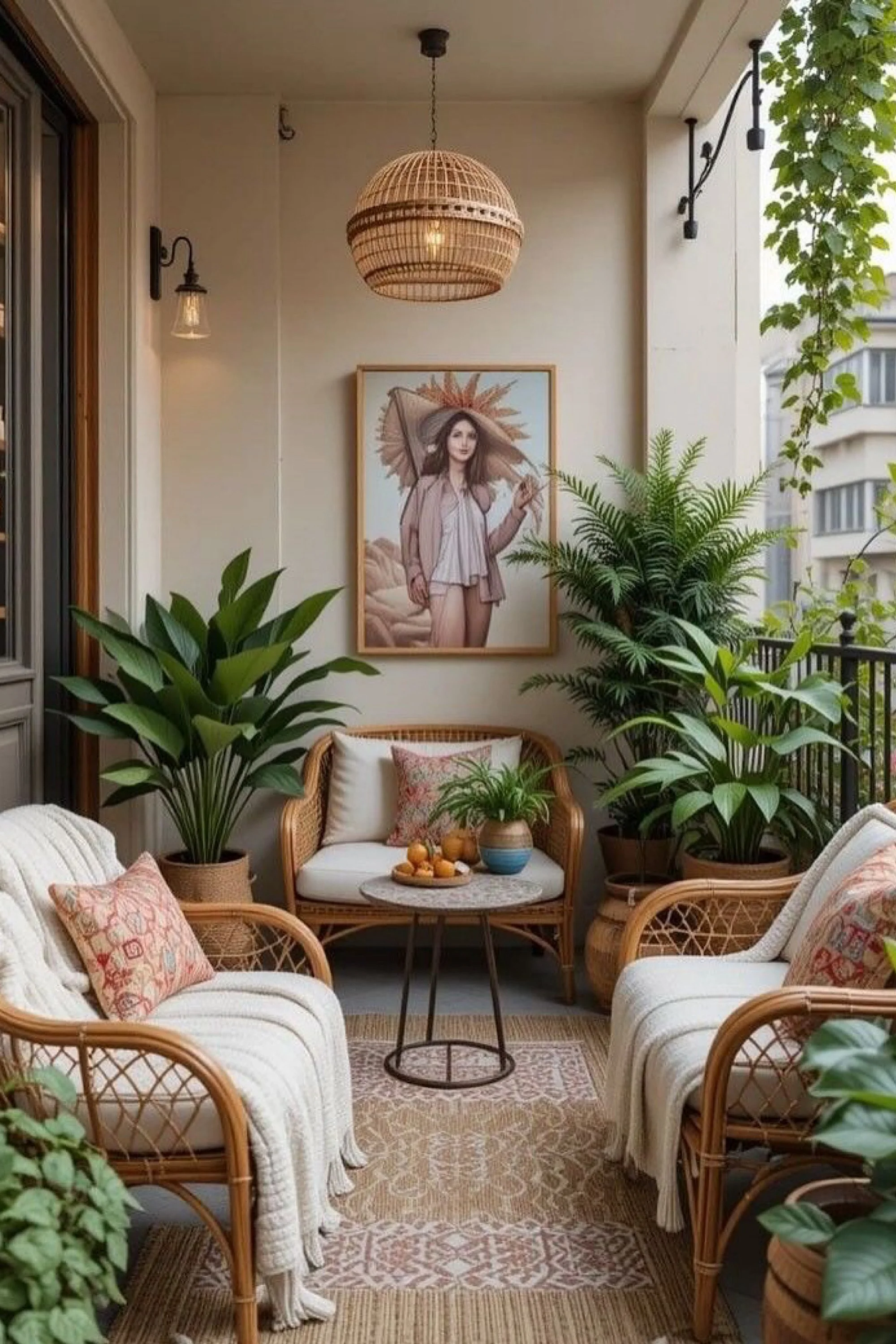 This artistic boho balcony is a perfect blend of natural textures and personal style. Two rattan armchairs with cream cushions flank a small round table, ready for coffee or cocktails. Layered rugs and throws add softness, while potted ferns and leafy plants bring a fresh vibrance. The focal point is the framed portrait on the wall, giving the space a personalized, gallery-like feel. Overhead, a woven pendant light casts a warm glow in the evening, tying the look together with understated elegance.