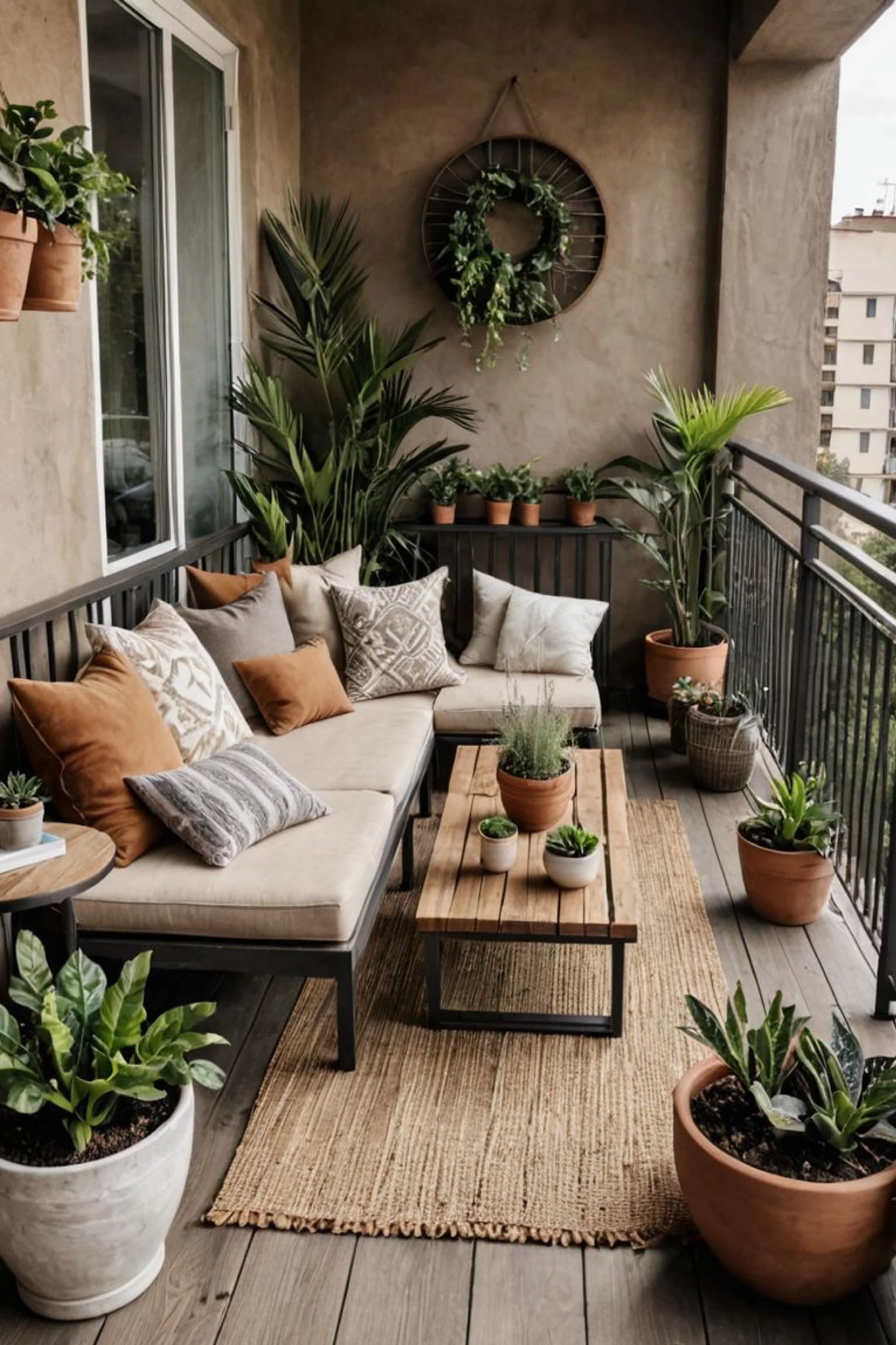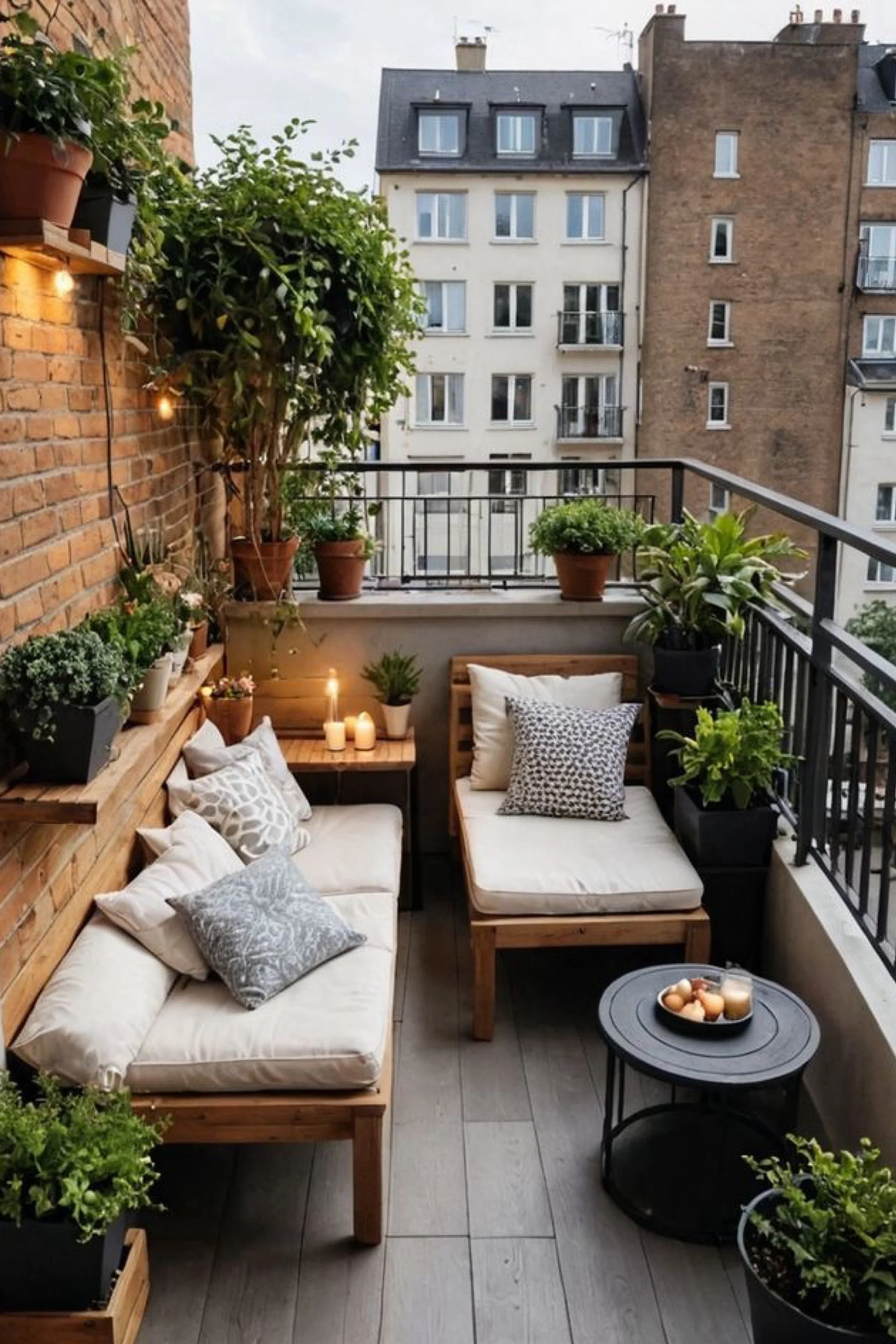 Start by defining zones, no matter how small. A single chair and side table in one corner become a reading nook. A narrow bench along the railing can double as seating and a display for potted plants. Hanging planters draw attention upward, making the space feel taller. Mirrors, used sparingly, can create the illusion of depth.