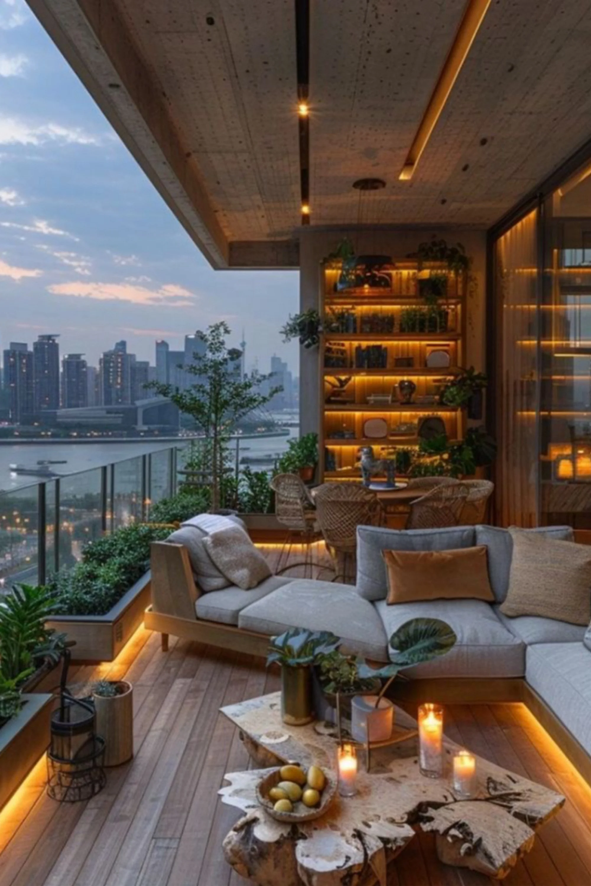 This open-air city terrace basks in golden hour’s magic, with the river below mirroring the warm light spilling from recessed strips and glass candle holders. A sleek sectional in pale gray stretches luxuriously along the deck, accented by textured neutral pillows that whisper casual elegance. The standout feature is the organic, live-edge coffee table topped with lemons and simple glass votives — a perfect mix of rustic and refined. Built-in planters brim with greenery, while an open shelving wall glows from within, showing off ceramics, books, and cascading vines. The space flows effortlessly into a woven rattan dining set, making it ideal for a quiet breakfast or evening wine under the stars.