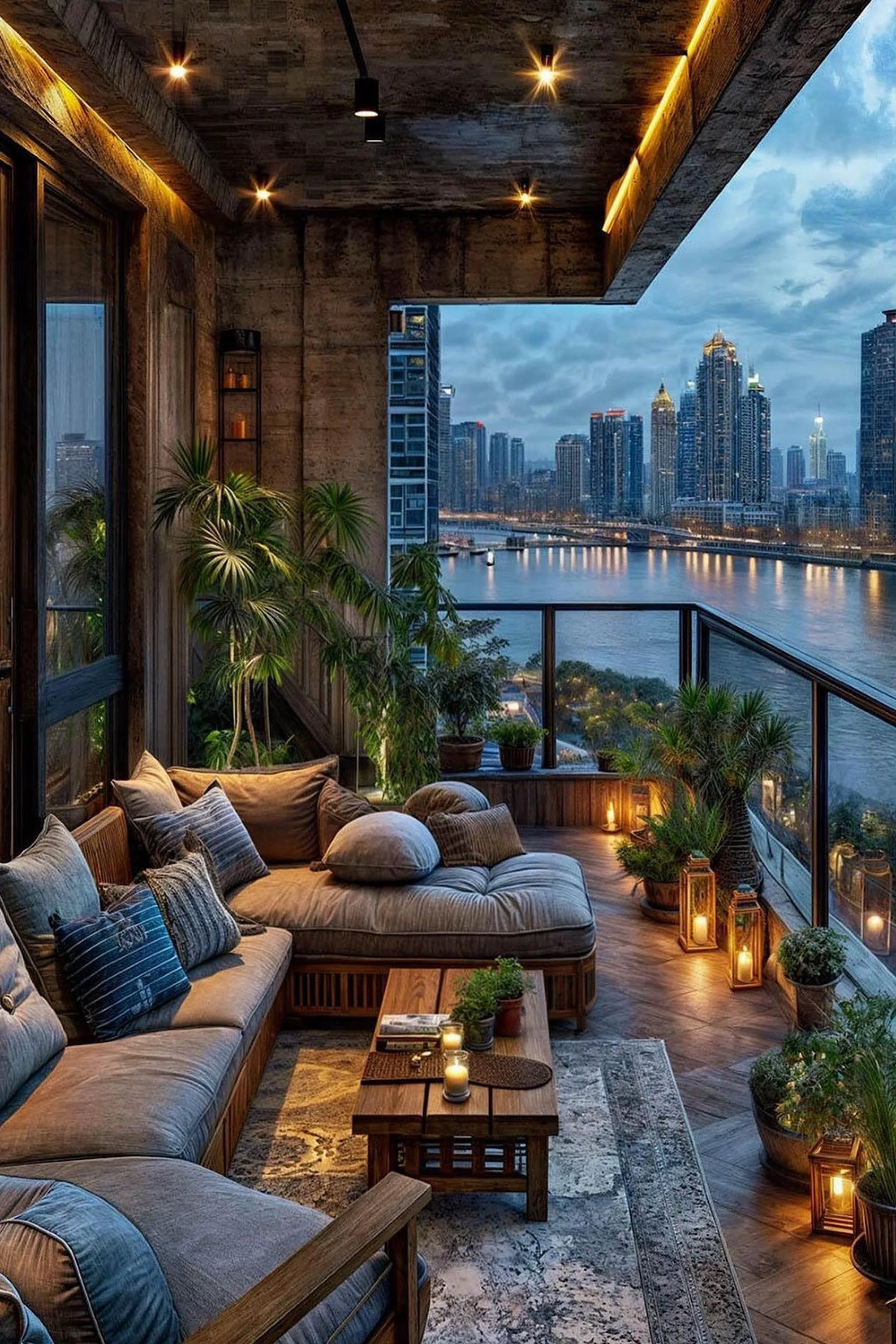 This terrace is the definition of a city sanctuary — a space where raw concrete meets lush greenery, softened by the golden flicker of candlelight. Overlooking a sparkling river with skyscrapers rising like guardians of the skyline, this terrace captures the heartbeat of urban living. Deep-cushioned sectionals in muted grays invite hours of lounging, while a low wooden coffee table holds flickering candles and a few potted herbs for a grounded, natural touch. Tall palms and tropical greenery breathe life into the edges, their silhouettes swaying gently in the evening breeze. Lanterns line the perimeter like little lighthouses, guiding the way toward serenity. Overhead, warm recessed lighting and a hint of strip lighting along the concrete ceiling create a moody cocoon, perfect for both intimate conversations and solo reflection.