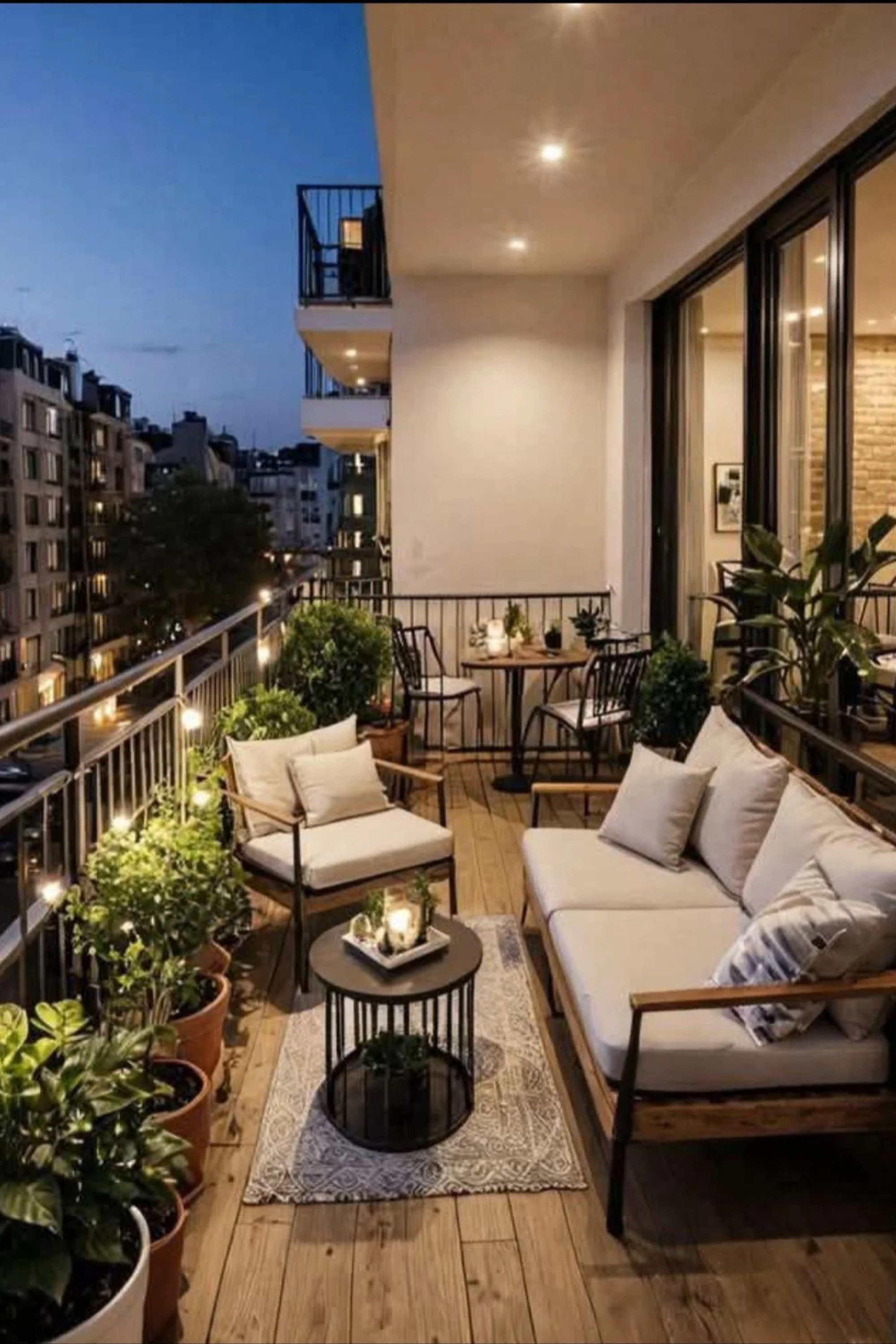 Overlooking charming rooftops and glowing streets, this city balcony is a masterclass in accessible elegance. Wooden deck planks lead to a cozy seating arrangement — a simple wood-and-metal sofa and matching chairs with crisp beige cushions. Terracotta pots overflowing with leafy greens line the railing, giving the urban view a burst of natural life. Small café tables sit ready for evening drinks, while string lights wrap the balcony in a warm embrace. The understated design lets the plants take center stage, making it perfect for those who want a city escape without leaving home.