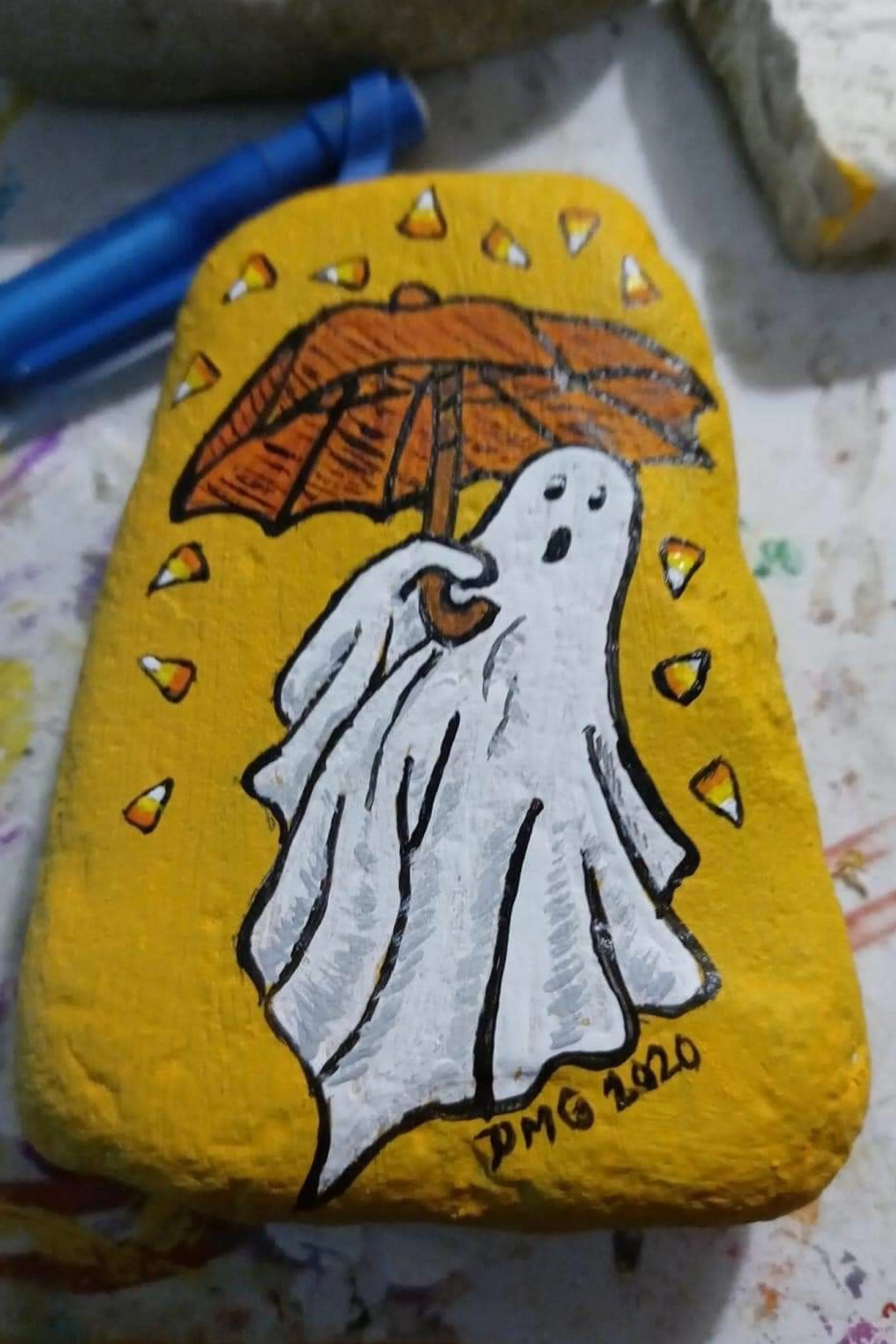 This whimsical painted rock shows a ghost holding a brown umbrella as candy corn rains down from the sky. The ghost is draped in a classic white sheet with two dark eyes, appearing startled yet playful under its umbrella. The background is painted a bold yellow, making the orange, yellow, and white candy corn pieces pop brightly. The design feels cheerful and imaginative, offering a playful take on Halloween imagery. The candy corn details tie the piece directly to the season’s sweetest traditions, blending humor and festivity with a hand-painted charm.