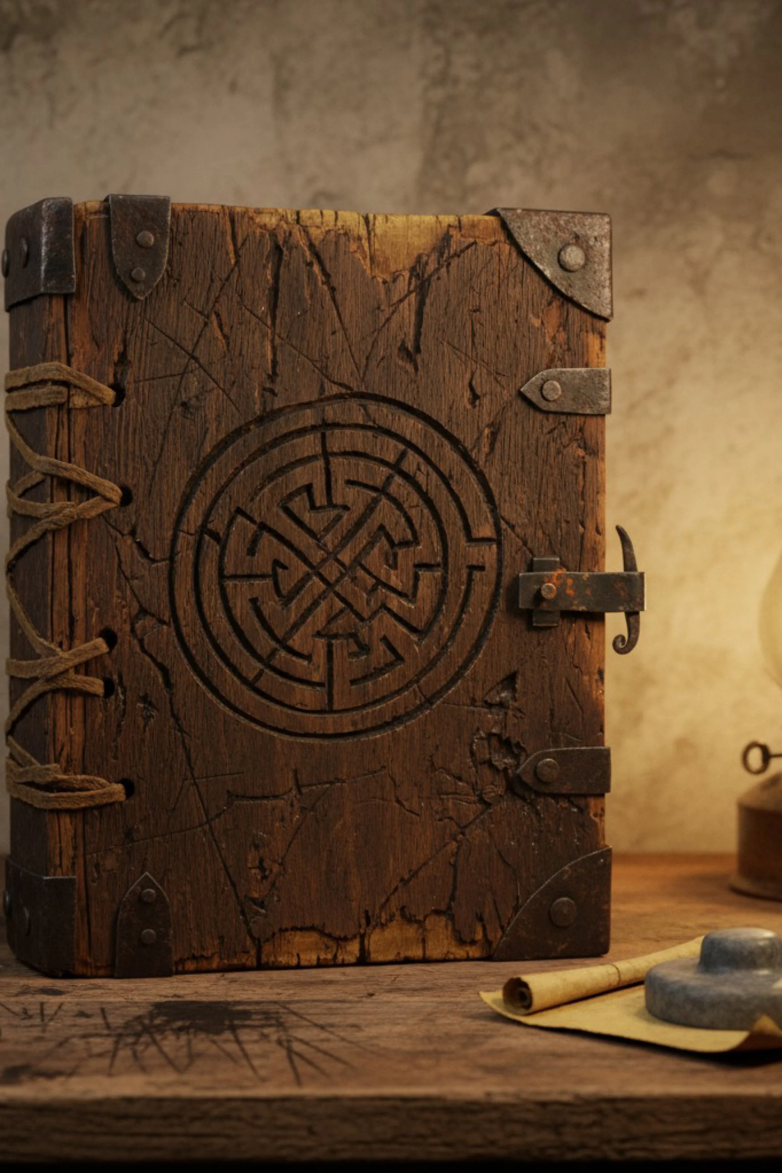 The Labyrinth Ledger is carved from rough-hewn wood, bound with leather cord and reinforced by iron brackets that hint at ancient endurance. Its cover bears a maze-like emblem etched deep into the timber, weathered by time and heavy use. The surface is scarred with marks of age, scratches that suggest countless journeys and hands before. More artifact than book, it embodies endurance, tradition, and the puzzle of paths untaken. The ledger feels like it might hold records of trials, maps of hidden routes, or oaths bound by blood and stone. Placed on a wooden table alongside scrolls and tools, it radiates the gravitas of ancient craftsmanship.