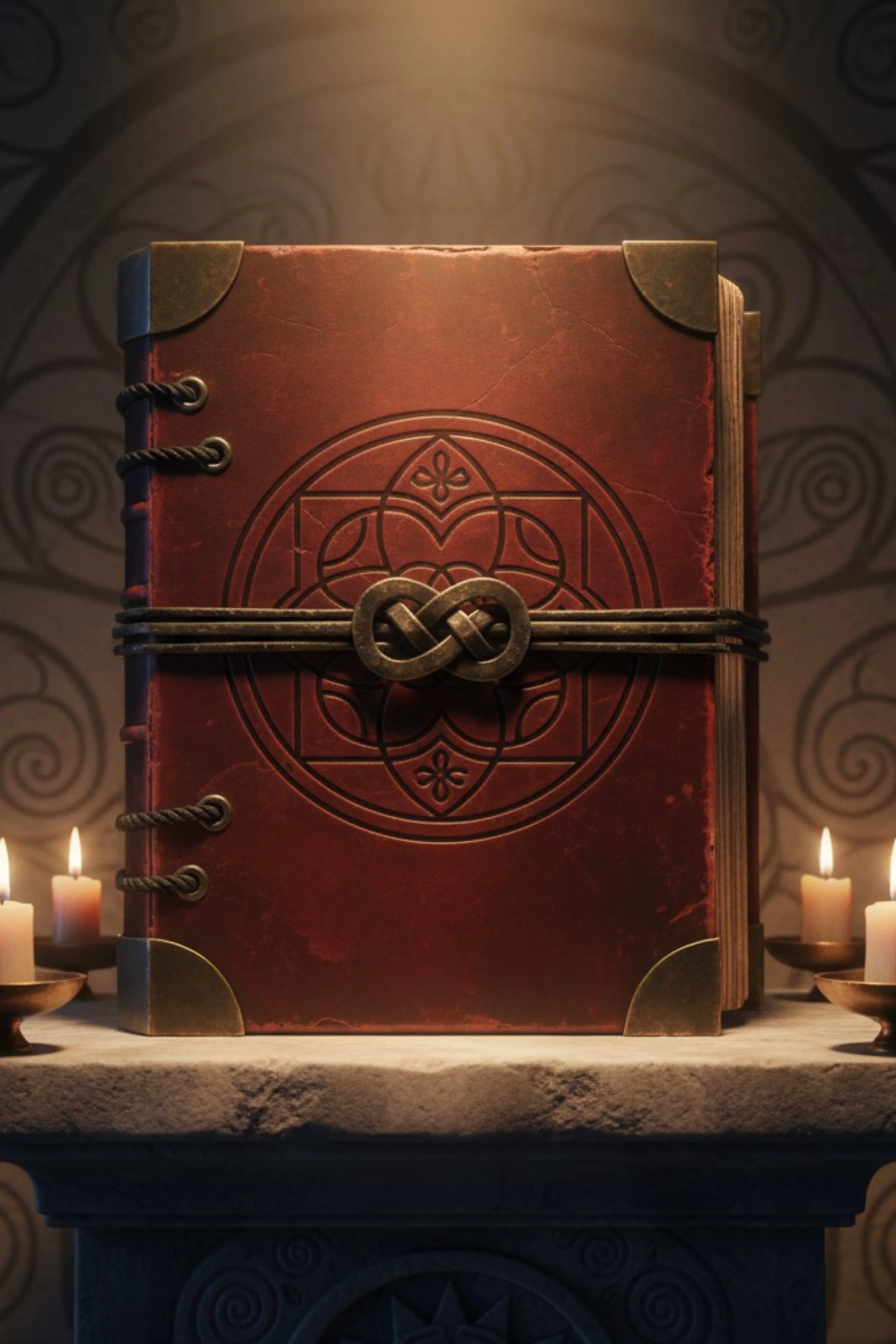 Bound in crimson leather embossed with circular knotwork, The Red Seal Codex commands attention with its bold symbolism. A thick strap and iron clasp adorned with an eternal knot bind the tome tightly, suggesting its secrets are not easily revealed. Brass corner guards lend it both durability and reverence, while candlelight glows upon its surface as though it thrives in ritual spaces. The interwoven design reflects unity, cycles, and binding contracts — knowledge preserved in sacred trust. This is a manuscript of oaths, covenants, and mystical unions, where each page feels like a vow sealed in fire and wax. Its atmosphere is one of ceremony and reverence, meant to be opened only when the air is thick with candle smoke and whispered invocations.