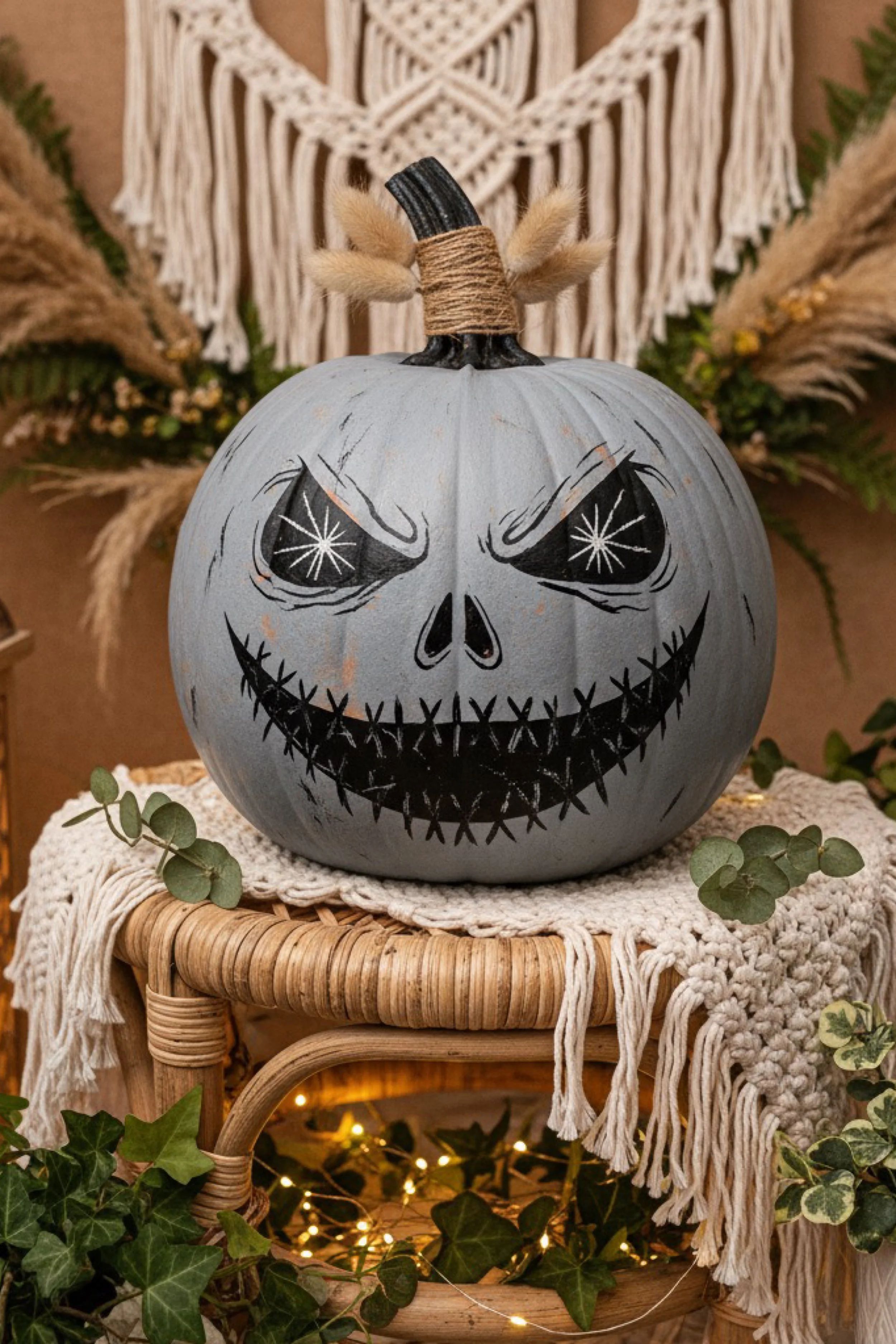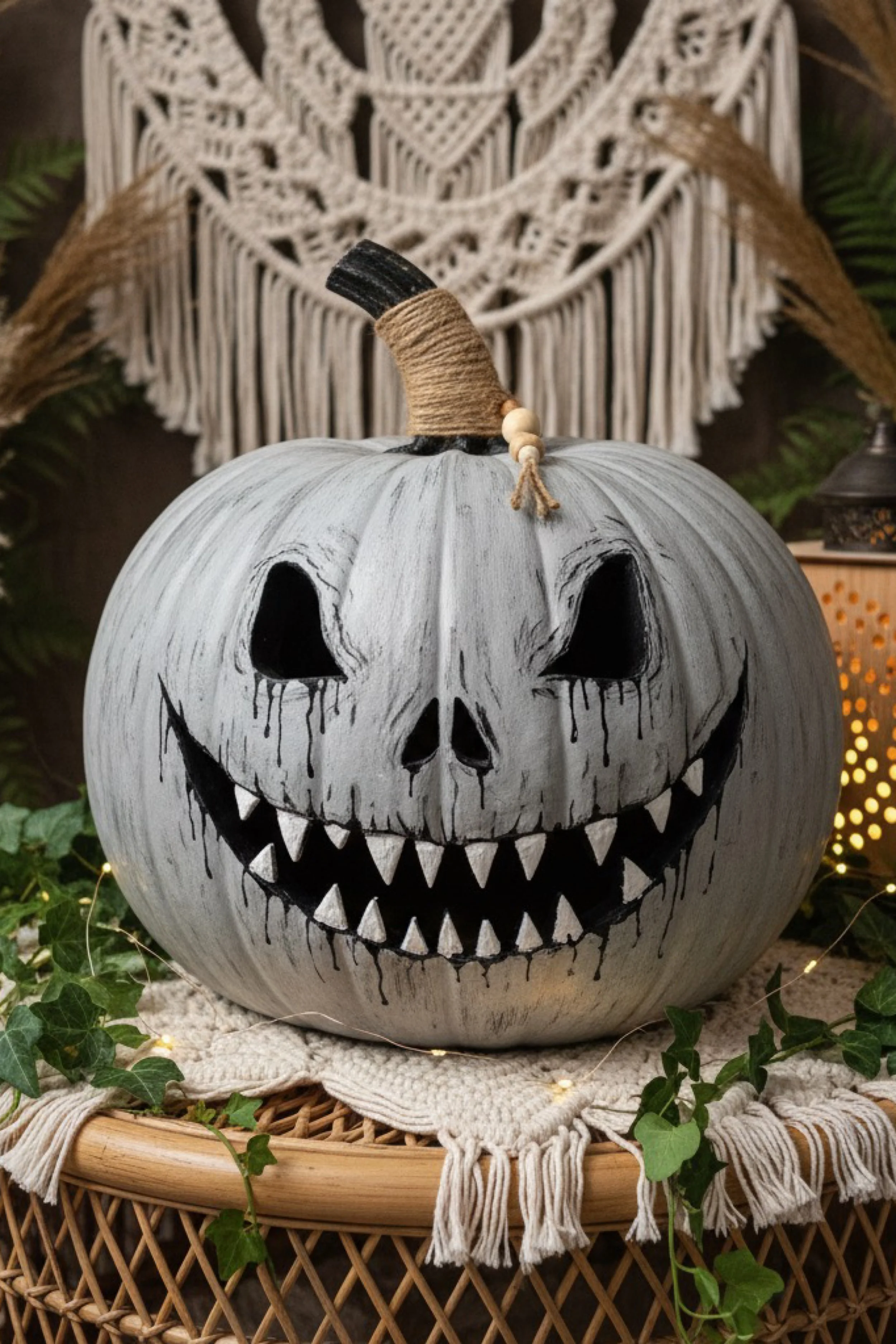 This black pumpkin’s hollow eyes and faintly smiling mouth are brushed with rough, ghostly strokes of white paint that give it the charm of a spirit who’s seen centuries pass. It’s subtle, haunting, and human in expression—a quiet watcher rather than a screamer. The stem wrapped in copper twine adds warmth to its cold stare, while the macramé backdrop softens the scene into boho Halloween elegance. Surrounded by greenery and amber lights, it becomes the kind of haunting that feels poetic rather than gruesome.