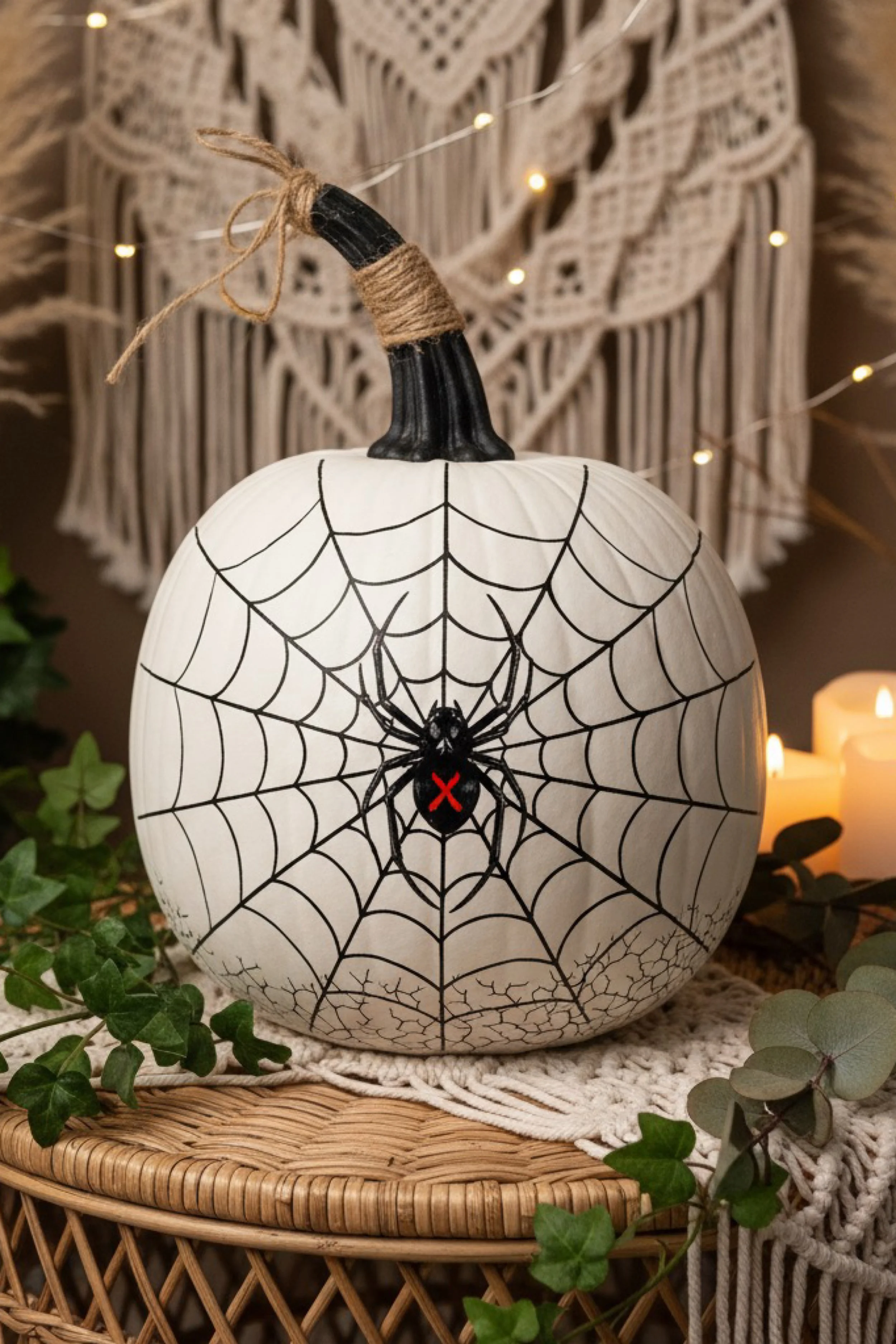 To style it seamlessly, build a natural but intentional display. Use a soft macramé base to contrast the sharp geometry of the web design. Frame the setup with taper candles or tea lights, using golden or ivory holders for warmth. Keep the color palette minimal—black, white, beige, and green. Add sprigs of eucalyptus or ivy for organic balance, and choose candles with soft flames to reflect gently across the pumpkin’s smooth surface. The goal is to create a spider’s lair that feels sacred rather than sinister, calm in its power.