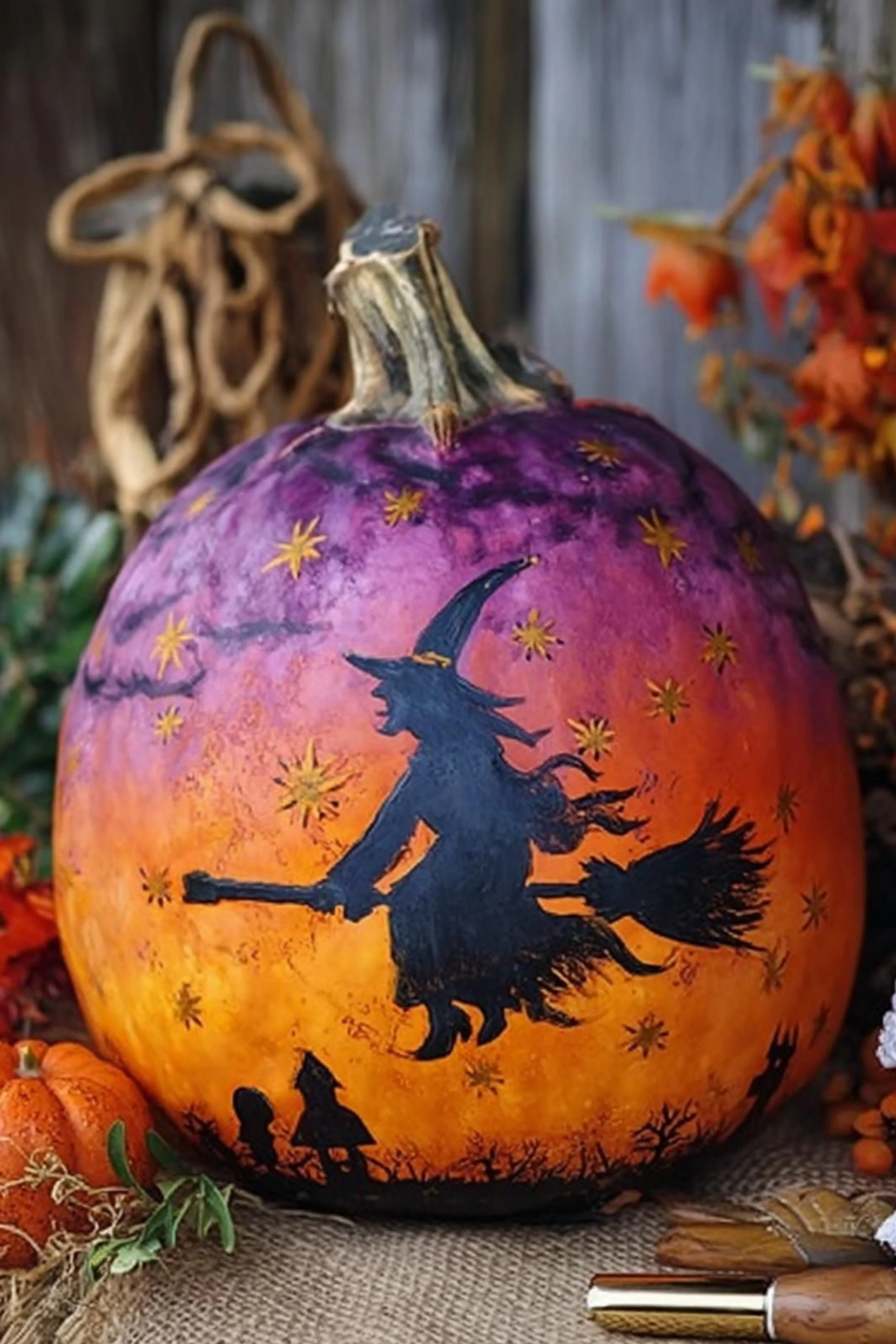 A streak of orange and violet sets the sky ablaze as a silhouette witch flies across this pumpkin’s curved horizon. Stars glimmer around her broomstick, and small black cats and pumpkins sit below, watching the night unfold. The blending of colors creates a surreal dusk—half dream, half danger. It’s playful yet elegant, perfect for capturing the spirit of Halloween without tipping into kitsch.