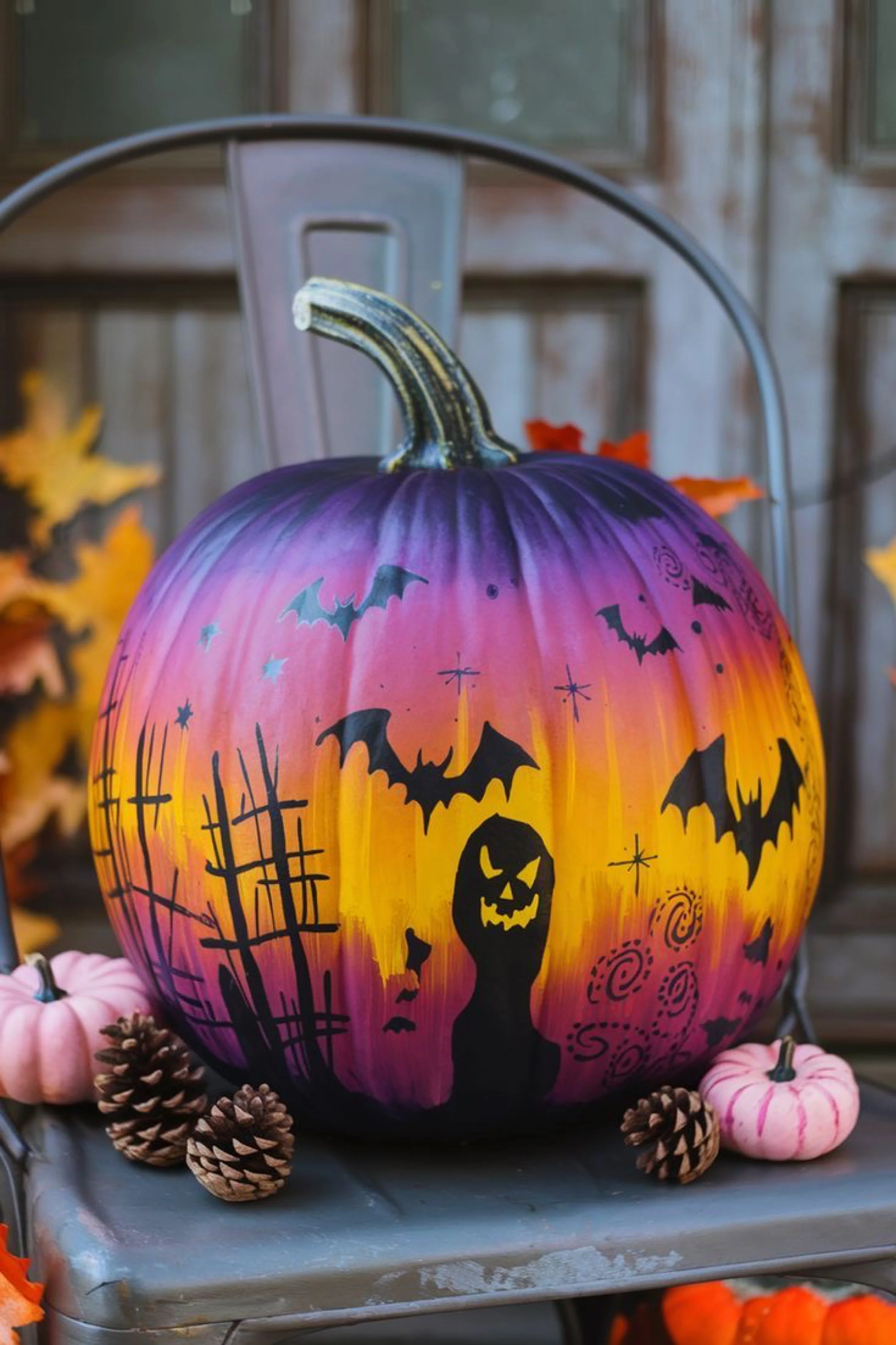 To style it, pair with bold purple and black accents to complement the painted hues. A bright table runner or candy bowl filled with neon-wrapped treats will tie the look together. For family decor, set a few of these pumpkins along a windowsill or on porch steps where sunlight enhances the cheerful tone. Indoors, they look great mixed with paper bats on the wall and clusters of LED candles. Add a few whimsical touches—a plush ghost or glittery spider—to complete the playful atmosphere.