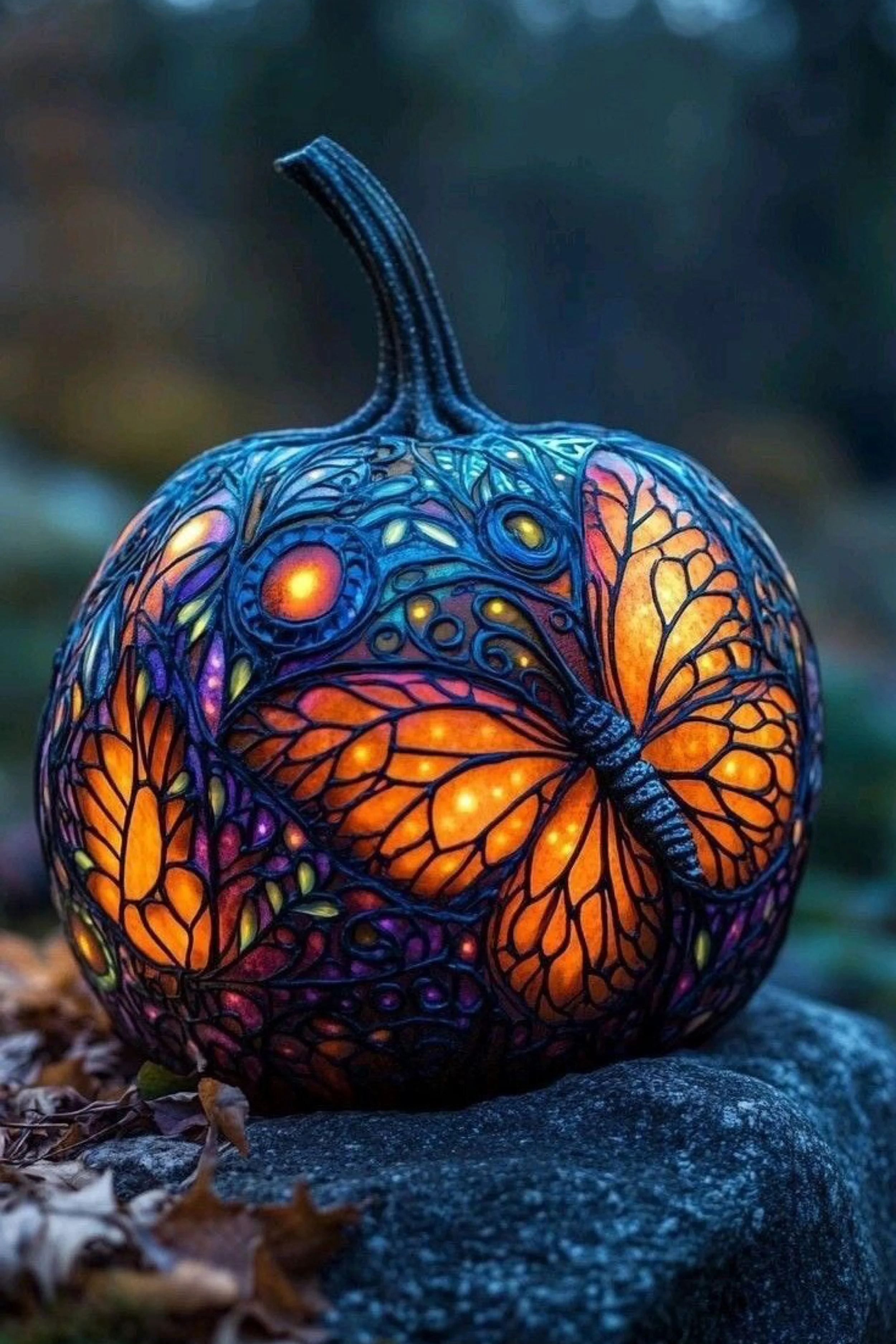 For display, let natural sunlight hit the painted surface to amplify the shimmering hues. Indoors, place it near amber fairy lights or against a dark backdrop to highlight the colors. Surround it with teal glass votives, faux moss, or raven figurines for a mysterious woodland feel. Outdoors, it pairs beautifully with metallic pumpkins in silver or copper to add contrast. This design suits those who love subtle gothic art with a painter’s touch—less fright, more fantasy.