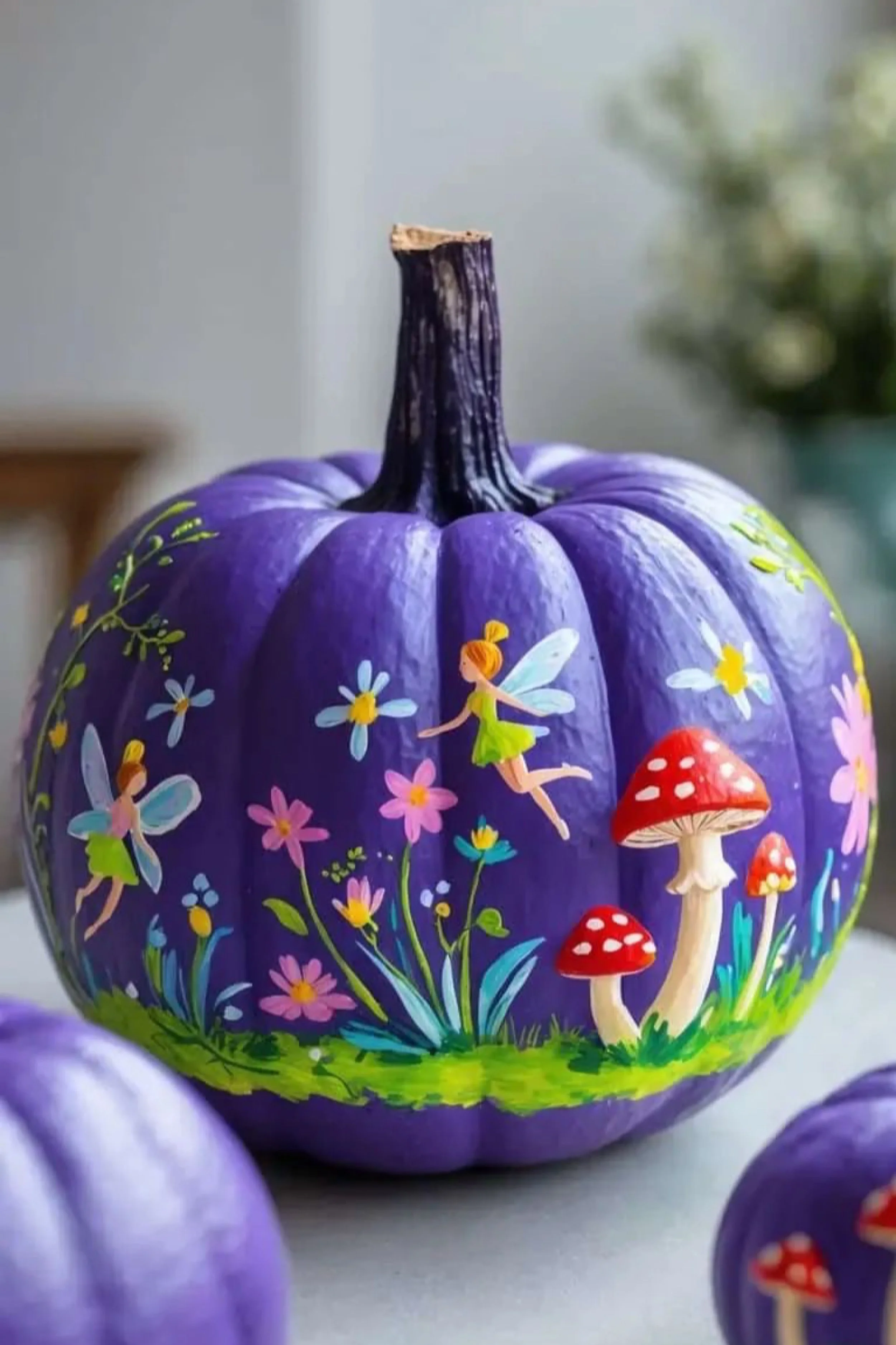 This purple pumpkin captures the essence of enchanted forests and moonlit wonder. Tiny fairies with gossamer wings dance among blooming flowers and toadstools, their pastel dresses fluttering as though caught mid-laughter. The deep violet base glows softly beneath the delicate strokes of greens, pinks, and reds, making every painted detail feel alive. It’s whimsical yet refined, like something found on a woodland windowsill under a full moon.