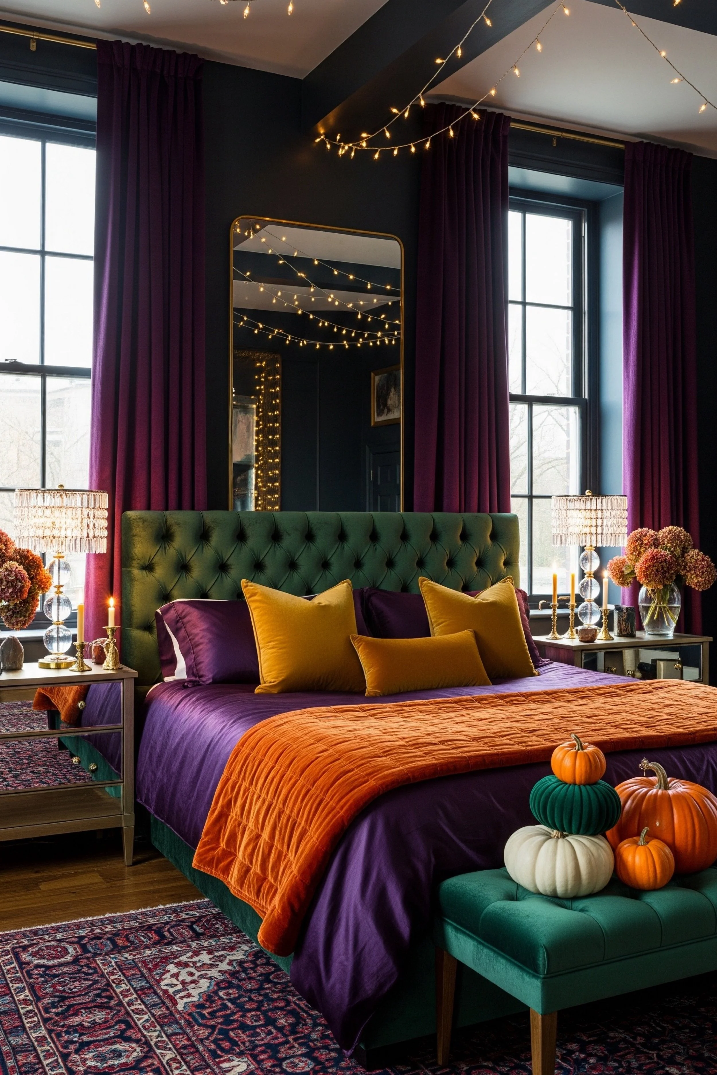 This moody bedroom drips with glamour and intrigue. Deep plum curtains frame the emerald velvet headboard like a stage, while golden accents shimmer softly in the candlelight. The orange quilt and mustard pillows bring warmth to the rich purple bedding, creating a palette both bold and sophisticated. String lights twinkle above like distant stars, softening the drama with a touch of romance. Mirrored nightstands, crystal lamps, and stacked pumpkins add layers of personality. The space feels cinematic—modern, sensual, and designed for evenings spent lingering in luxury.