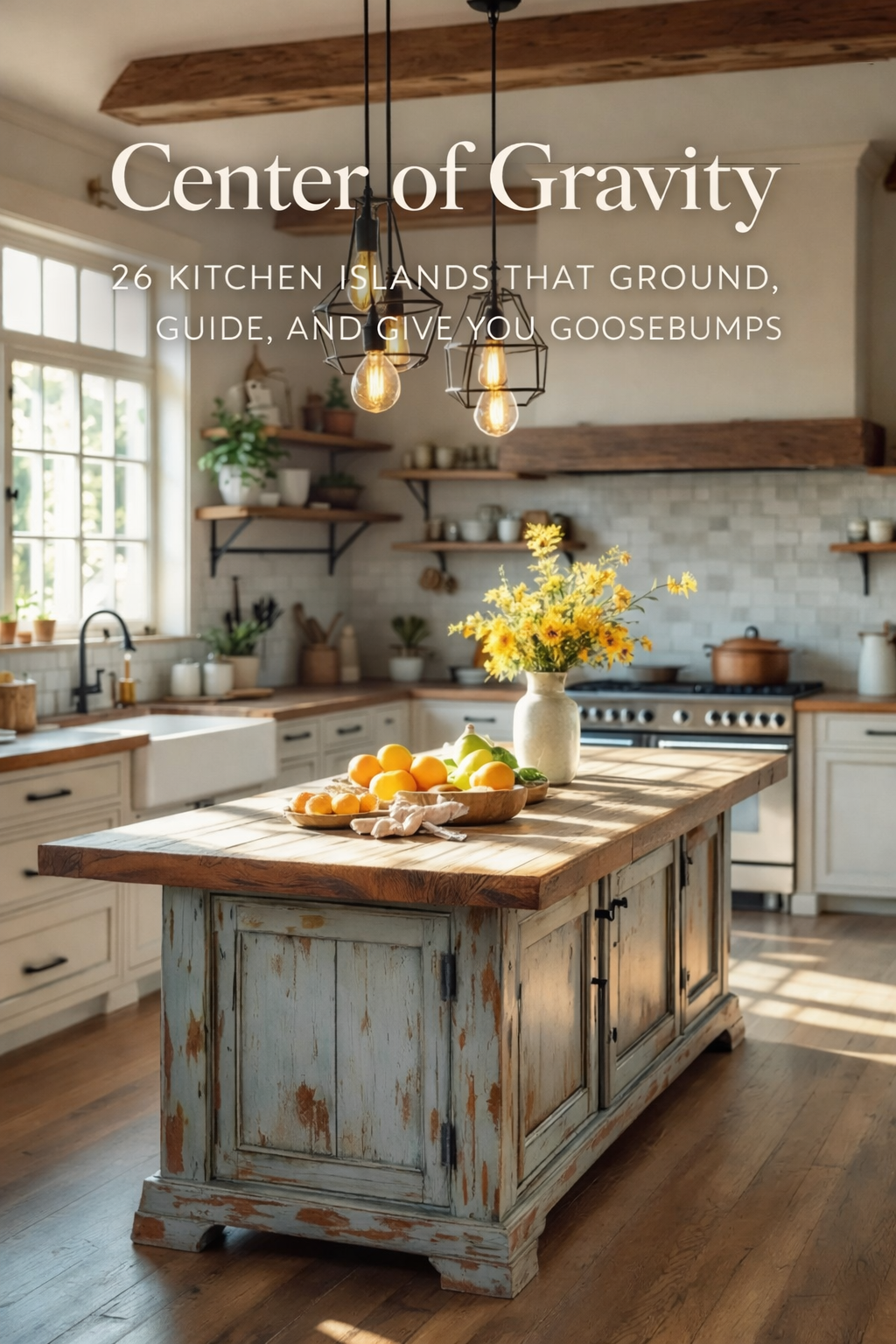 Soaked in golden morning light, this distressed island radiates effortless charm. Its faded blue base carries a sense of history, perfectly imperfect in all the right ways. The wood surface is gently worn, telling quiet stories of morning coffees and slow afternoons. A vibrant bowl of fruit adds a splash of color and cheer, inviting you to come closer. Overhead, three pendant lights sway softly, like dance partners poised to move with you. It’s gentle, inviting, and full of quiet personality—an easygoing focal point that still manages to steal the show.