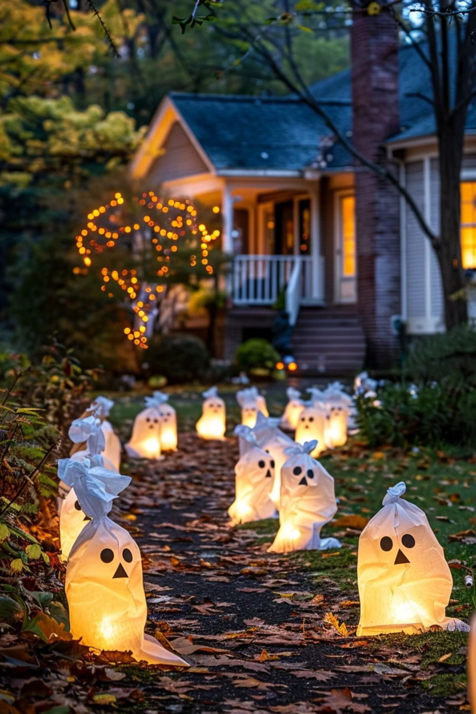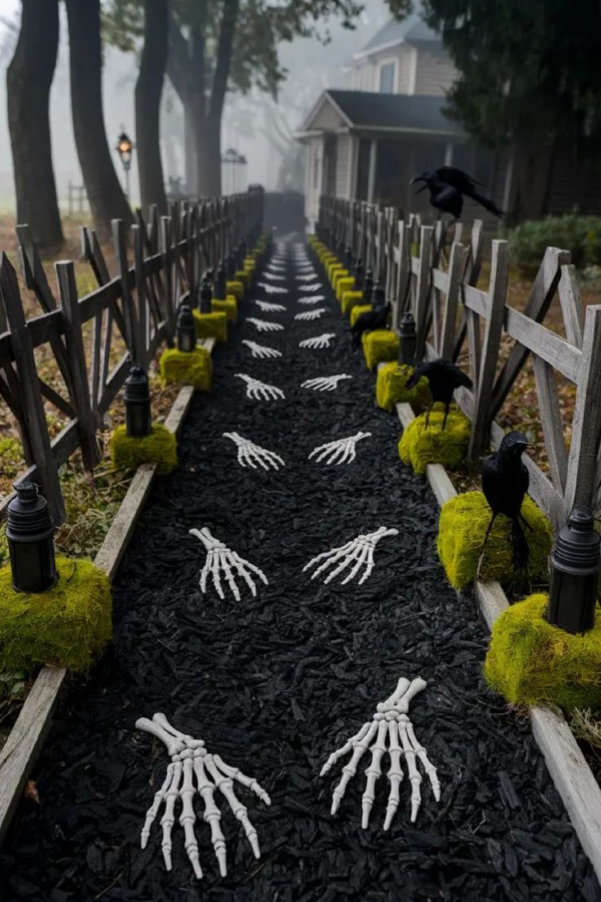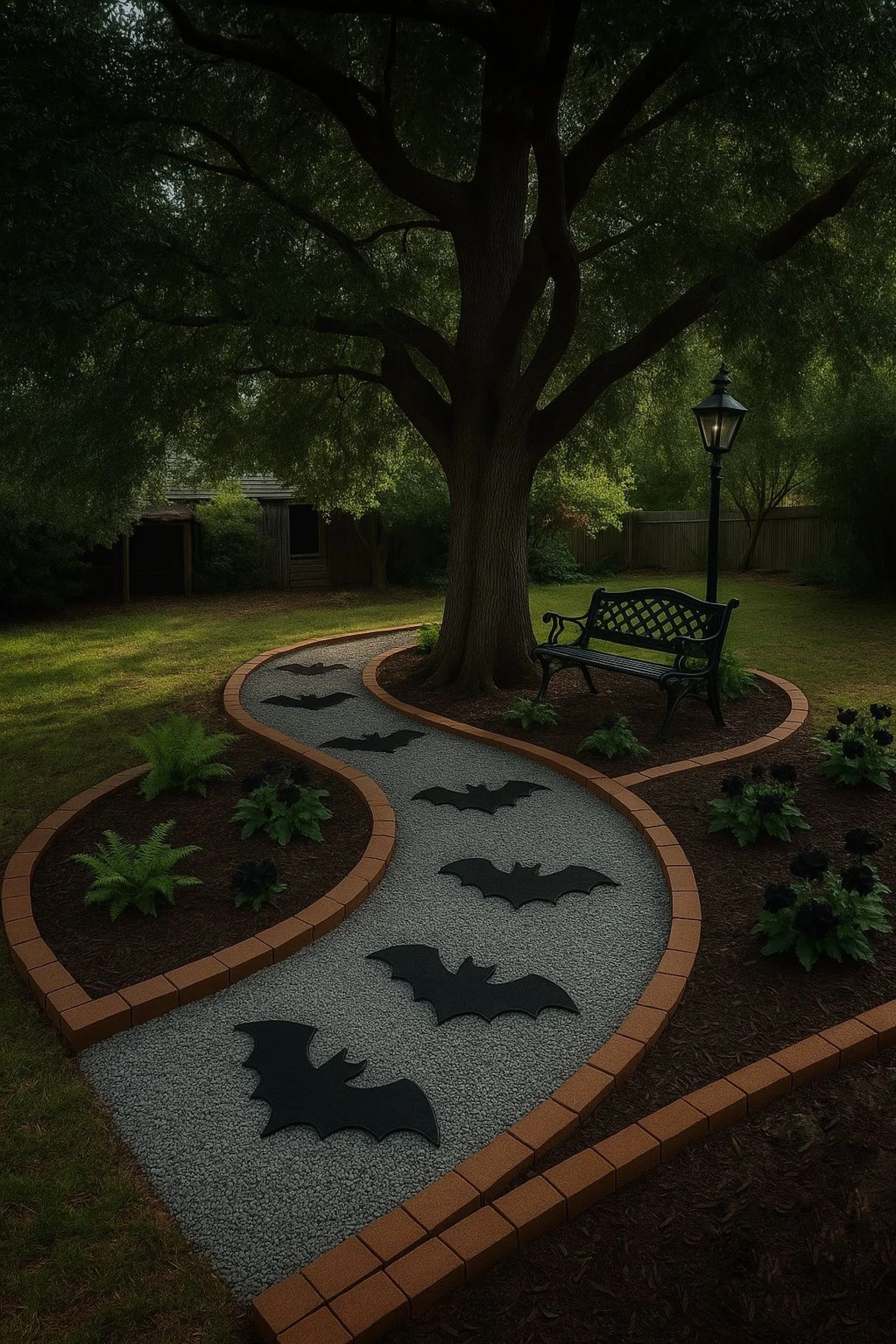 - Themed stepping stones (bats, ravens, cats) to cue the mood.