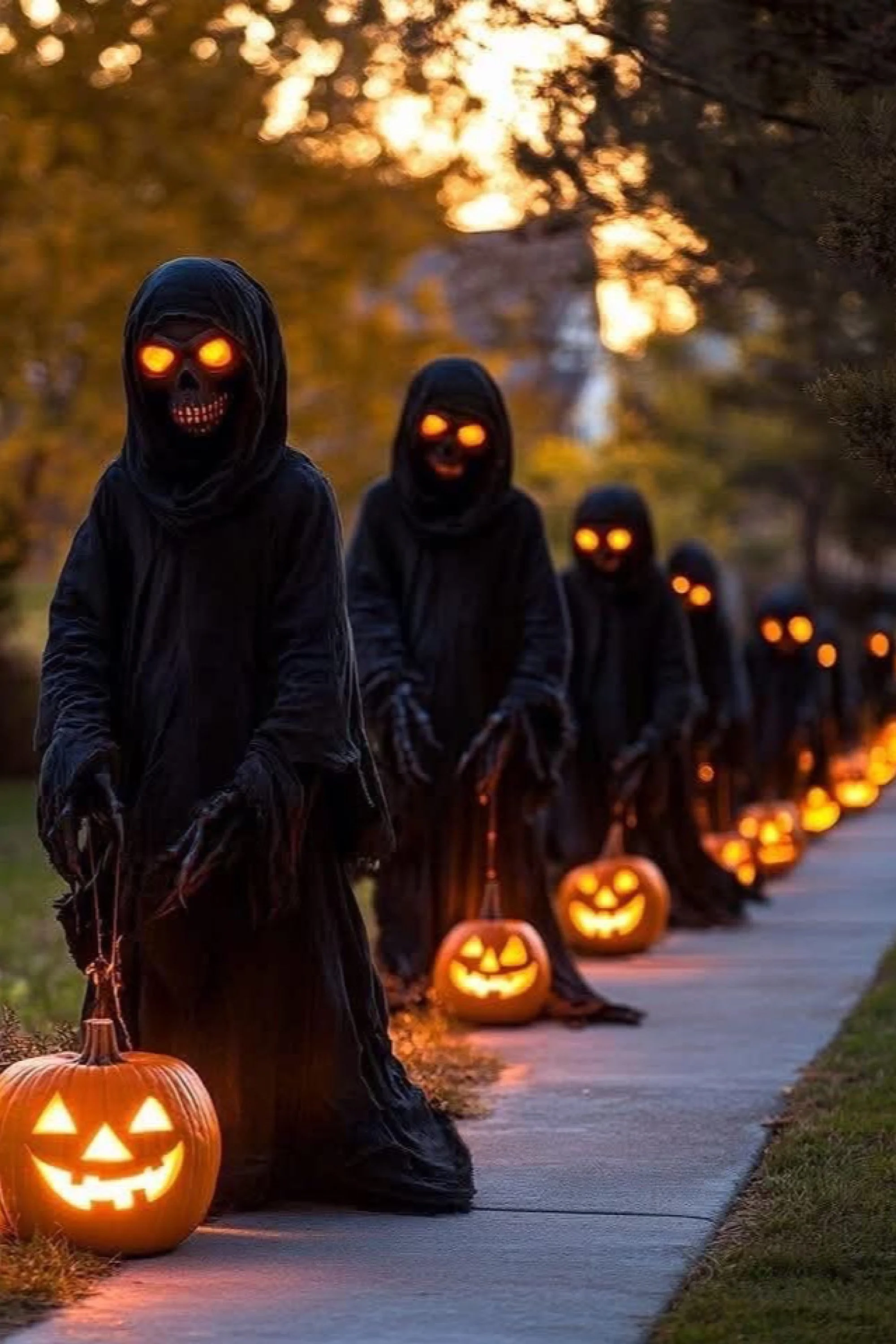 The sun had bled itself into the horizon, leaving the world washed in that brief, electric hour where everything looks sharper than it should. Lena stood at the mouth of the next path, the one Rowan had promised would test her nerve. Ahead, a row of figures waited — tall, robed, skeletal hands gripping carved pumpkin lanterns. Each jack-o’-lantern grin blazed with an inner fire, the flicker catching on the slick black folds of their shrouds. The eyes… the eyes were the worst — not glass, not paint, but orbs of molten ember that stared without blinking.