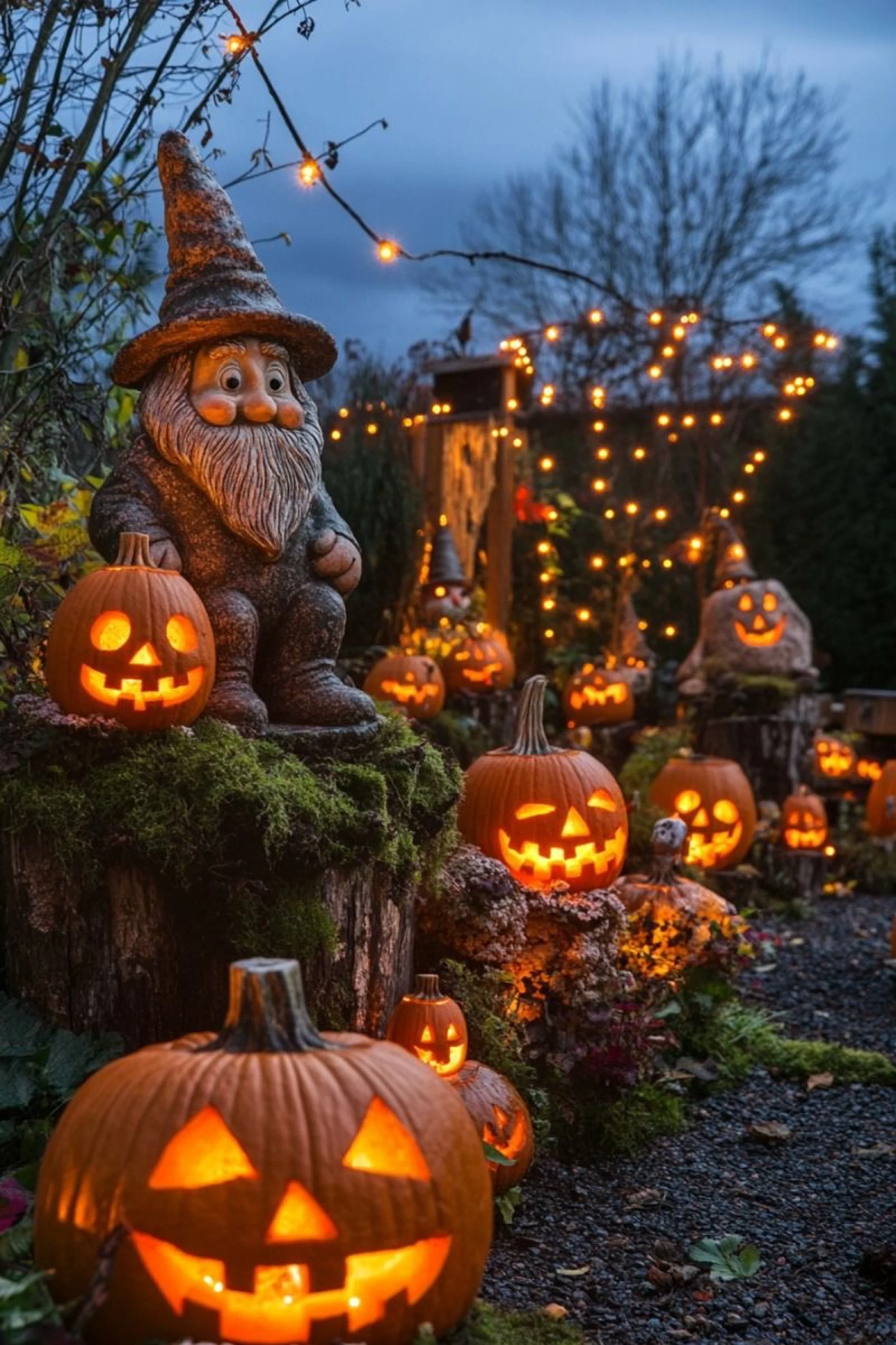 Twinkling orange string lights draped between bare branches above, their gentle glow casting faint halos on the moss below. They should have been comforting. Instead, they highlighted the fact that every single pumpkin was angled just so — all of them facing inward, toward the gnome.